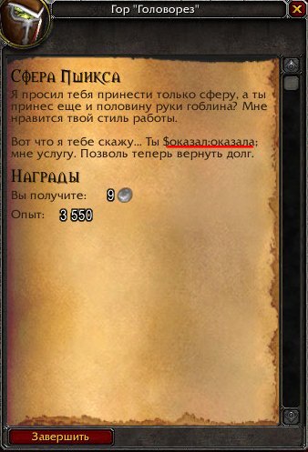 | Steps To Reproduce | 1. Взять квест https://www.wowhead.com/ru/quest=25260/сфера-пшикса у https://www.wowhead.com/ru/npc=39379/гор-головорез. 2. Выполнить квест. 3. Сдать квест https://www.wowhead.com/ru/npc=39379/гор-головорез. | ||||