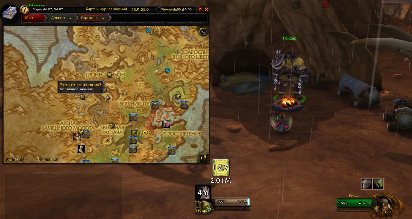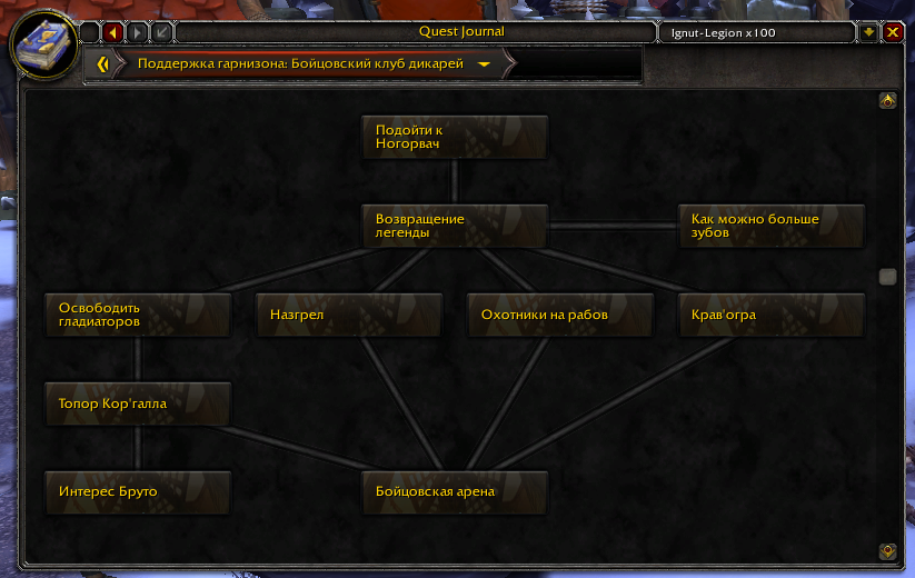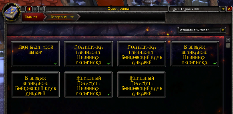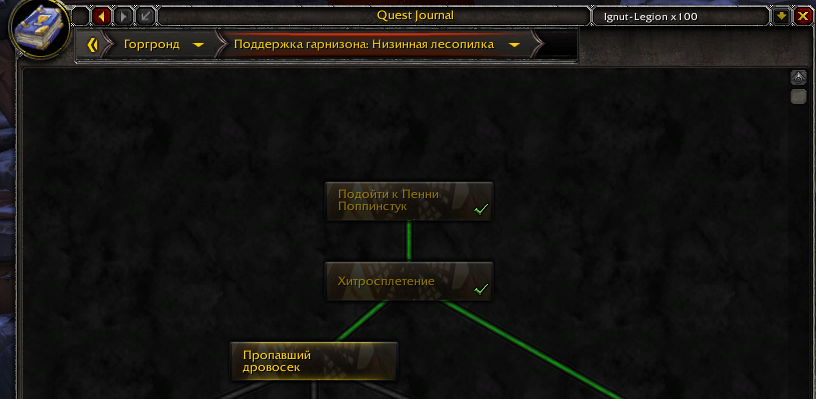 | Description | Начал проходить квесты в локации выполнял всевозможные, без разбору - с автопринятием/автосдачей. Дошел до цепочки "Поддержка гарнизона" https://www.wowhead.com/ru/storyline/%D0%BF%D0%BE%D0%B4%D0%B4%D0%B5%D1%80%D0%B6%D0%BA%D0%B0-%D0%B3%D0%B0%D1%80%D0%BD%D0%B8%D0%B7%D0%BE%D0%BD%D0%B0-54 У таргет нпс, который должен выдавать квест, ничего нету (скриншот 1) Если дело в строении которое выбрано на аванпосте, то поменять его не является возможным (скриншот 2) - у меня стоит лесопилка (открывающая шреддер, есть арена, открывающая, вроде как бойца) На карте есть список квестов, такие как https://www.wowhead.com/ru/quest=36508/%D1%8D%D1%82%D0%BE-%D0%BA%D1%82%D0%BE-%D1%82%D0%BE-%D0%B8%D0%B7-%D1%82%D0%B2%D0%BE%D0%B8%D1%85 и https://www.wowhead.com/ru/quest=36368/%D0%BF%D1%80%D0%BE%D0%BF%D0%B0%D0%B2%D1%88%D0%B8%D0%B9-%D0%B4%D1%80%D0%BE%D0%B2%D0%BE%D1%81%D0%B5%D0%BA , но прийдя на место квестодатель либо не даёт квест, либо его нету. карта (скриншот 3) эти квесты (4-5) | ||||