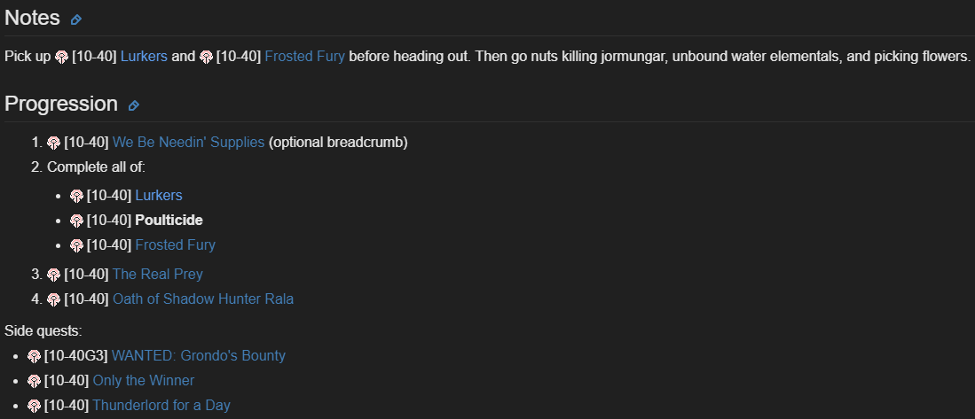 | Description | Легион плюс. Хребет Ледяного Огня. Орда. Магхар, охотник Квесты https://www.wowhead.com/ru/quest=34345/смертоносная-пыльца и https://www.wowhead.com/ru/quest=34344/ползучие доступны последовательно, а должны одновременно. Пруф: https://wowpedia.fandom.com/wiki/Poulticide В противном случае квест Ползучие должен приниматься первым, а Смертоносная пыльца вторым. | ||||