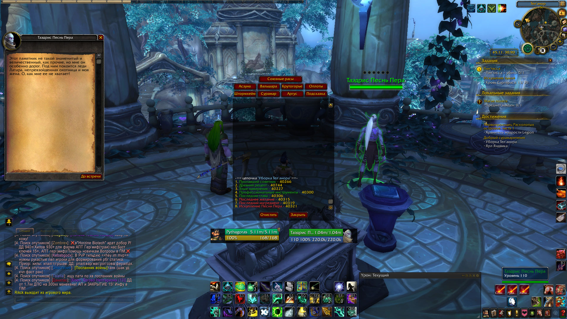 Поискать Таэдриса на остальных точках в Теланоре , он там прыгает как заяц. на Вовхеде есть такая статья https://ru.wowhead.com/achievement=11124/%D0%B4%D0%BE%D0%B1%D1%80%D1%8B%D0%B9-%D1%81%D1%83%D1%80%D0%B0%D0%BC%D0%B0%D1%80%D0%B8%D1%82%D1%8F%D0%BD%D0%B8%D0%BD#comments , список и последовательность квестов в основном верен. По крайней мере в этой цепочке квесты указаны в правильном порядке