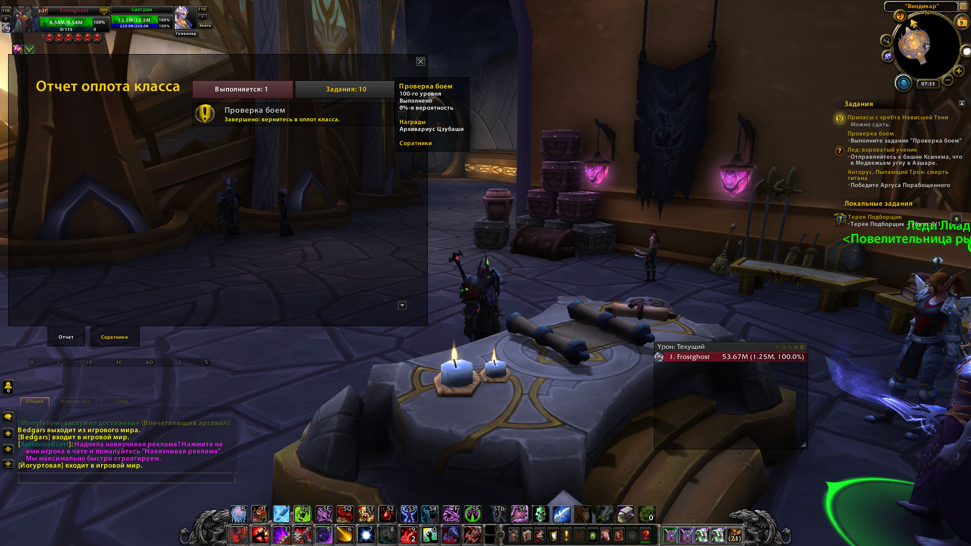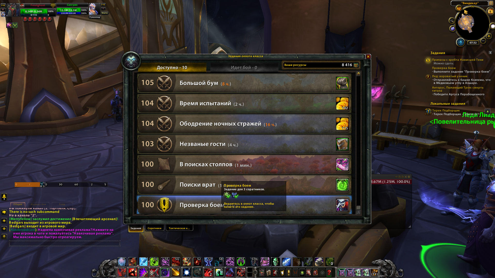 На Виндикаре. А если добраться в оплот класса и там проделать эти же манипуляции? И попробовать еще такое - посмотреть наличие доступных отрядов для найма, нанять отряд. Если свободных слотов нет - попробовать потерять отряд наемников на любой другой миссии и все таки сделать заказ, подождать 30 минут, забрать заказ. Сделать релог. Попробовать запустить в оплоте эту миссию - Проверка боем. Дикое предположение - карта на Виндикаре появилась вместе с Аргусом , она универсальная для всех классов. И предназначена в основном для выполнения миссий с Крокууна, возможно карта в оплоте немного другая. И если в оплоте подойти к карте - найдется выполненная миссия. Что на Эпике, что на УШОШ свой форум. И там и там есть спец темы в игровом разделе - на Эпике называются Проблемы с артефактным оружием http://forum.epicwow.com/topic/12659-problemy-s-artefaktnym-oruzhiem/ , Проблемы с квестами оплота http://forum.epicwow.com/topic/26468-problema-s-kvestami-oplota/ и самая главная тема http://forum.epicwow.com/topic/6261-problemy-s-personazhem-personazh-zastryal/ . На УШОШ ищите сами если оно ваш случай. Для общего развития можно почитать с какими проблемами народ туда обращается и как эти проблемы решаются. Багтрекер. Иногда игроки обнаруживают баги и сообщают на багтрекер. Если баг распространяется на все игровое пространство - тестер проверяет и передает баг разработчику на исправление. Иногда вместо глобального исправления разработчики делают заплатку. Если баг подтвержден, но вызван причиной , заплатка от которой уже есть у специальных НПЦ ДеБагер (их 2 в Даларане) - тестер отсылает к этим НПЦ . Там в меню выбрать пункт исправления бага и игрок играет дальше. Тестер ничего не может менять на игровых мирах, он только выполняет проверки по запросам игроков. И если рядом с Вашим персонажем создается такой же, у которого эта миссия и задание в оплоте выполняются нормально один, два, пять раз - проблема не общая, проблема именно на вашем персонаже. Что то происходит не так. Иногда тестеру удается найти причину забагивания конкретного персонажа, иногда нет. Я тоже обычный игрок, просто некоторый опыт в игре постепенно набирается, по противодействию багам. И иногда у меня есть время просматривать багтрекер и комментировать задачи. Ваше право не читать мои комментарии и не принимать их во внимание. Но тестеры то разорваться на всех не могут, а так Вам не скучно. |