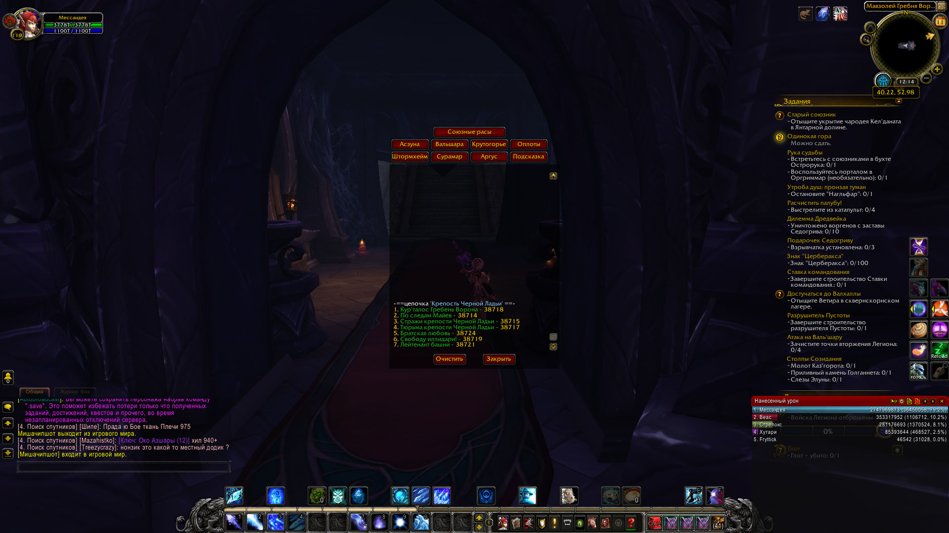 | Description | 9.07.2019 выполнила всю цепочку в Валь'шаре, получив достижение "Полная Валь'шара". 11.07.2019 зашла в игру и обнаружила невыполненную главу "Крепость Черной Ладьи". По новой выполнить цепочку не могу, ибо нет НПС, у которого можно было бы взять задание. Подскажите, что делать? Без достижения не открою полеты. P.S. Для проверки запустила Ваш аддон Questline tester, который выдает, что задания выполнены (прилагаю скрины). | ||||