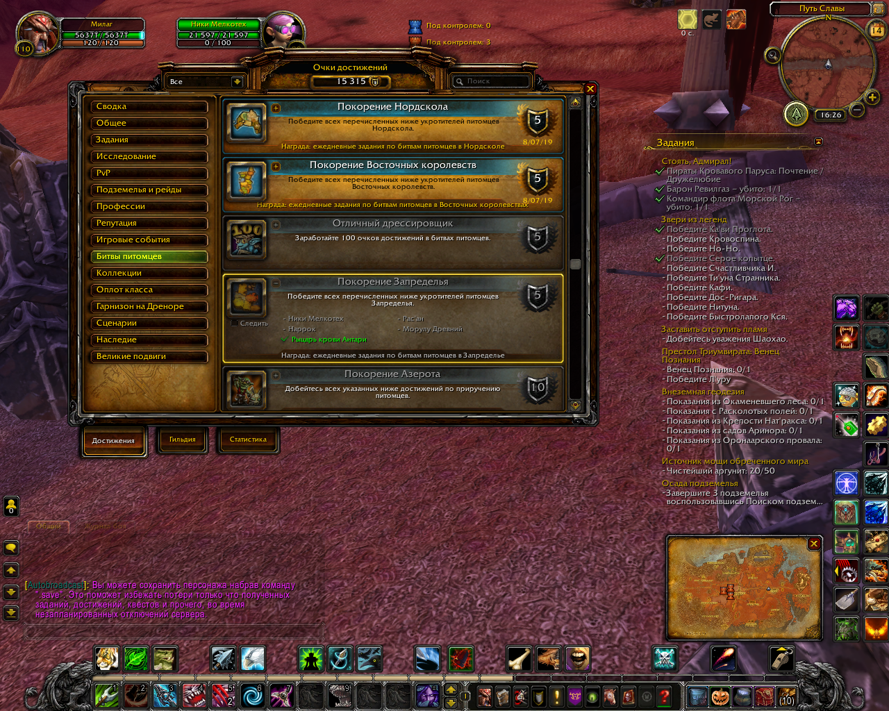 | Description | Сделал кв на бои питомцев восточных королевствах. Получил кв,чтоб вернуться к тренеру в Шторм,но он не дал кв на бои питомцев в запределье. В результате не могу сражаться в запределье с нпц, хотя тренер в долине призрачной луны дал кв на бой с ним, и после победы отправил в нордскол. В результате прошел и нордскол, и пандарию, и дренор. Но запределье так и не могу сражаться с нпц. Пытался сделать персом за орду - та же проблема: нет кв на бои питомцев в запределье. | ||||
