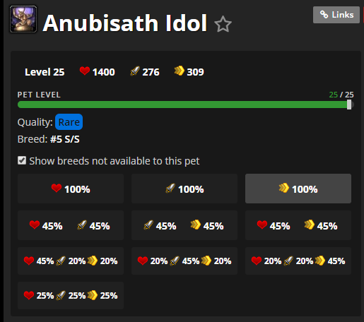 никакого "прока" там нет, а простая математика на уровне 5классы средней школы. The following formulas are used to calculate the primary stats for each breed: Health = ((BaseHealth + (HealthPts / 10)) * 5 * Level * Quality) + 100 Power = (BasePower + (PowerPts / 10)) * Level * Quality Speed = (BaseSpeed + (SpeedPts / 10)) * Level * Quality In the above, "Base[Stat]" is the level 1 stat, "[Stat]Pts" are the points allotted for that stat based on breed (see the table above), "Level" is the pet's level, and "Quality" is a numeric multiplier from 1.0 to 1.5: [Poor] = 1.0 [Common] = 1.1 [Uncommon] = 1.2 [Rare] = 1.3 [Epic] = 1.4 [Legendary] = 1.5 Breed IDs and Stat Allocation There are a total of 10 breed variants, each with its own strengths and weaknesses that mathematically contribute to a pet's primary stats. For each of these 10 configurations, there are actually two breed IDs. These two IDs are exactly the same, EXCEPT one indicates a male pet and the other, a female pet. MaleMale breeds = IDs 3-12 FemaleFemale breeds = IDs 13-22 The breed ID letter system uses the following letters to convey a pet's breed: H = Health P = Power S = Speed B = Balance Each letter is paired with another to represnt its breed. For example, H/H means the pet has a double dose of Health (0/20/0: breeds 6 and 16). P/B indicates Power mixed with Balance (4/9/4: breeds 10 and 20). B/B represents across-the-board Balance (5/5/5: breeds 3 and 13). See the complete list below. BREED LETTERS H/P/S 4/14 → P/P = 0/20/0 5/15 → S/S = 0/0/20 6/16 → H/H = 20/0/0 7/17 → H/P = 9/9/0 8/18 → P/S = 0/9/9 9/19 → H/S = 9/0/9 10/20 → P/B = 4/9/4 11/21 → S/B = 4/4/9 12/22 → H/B = 9/4/4 3/13 → B/B = 5/5/5 вся информация по базовым механикам петов есть в открытом доступе, и гуглится за пару минут |