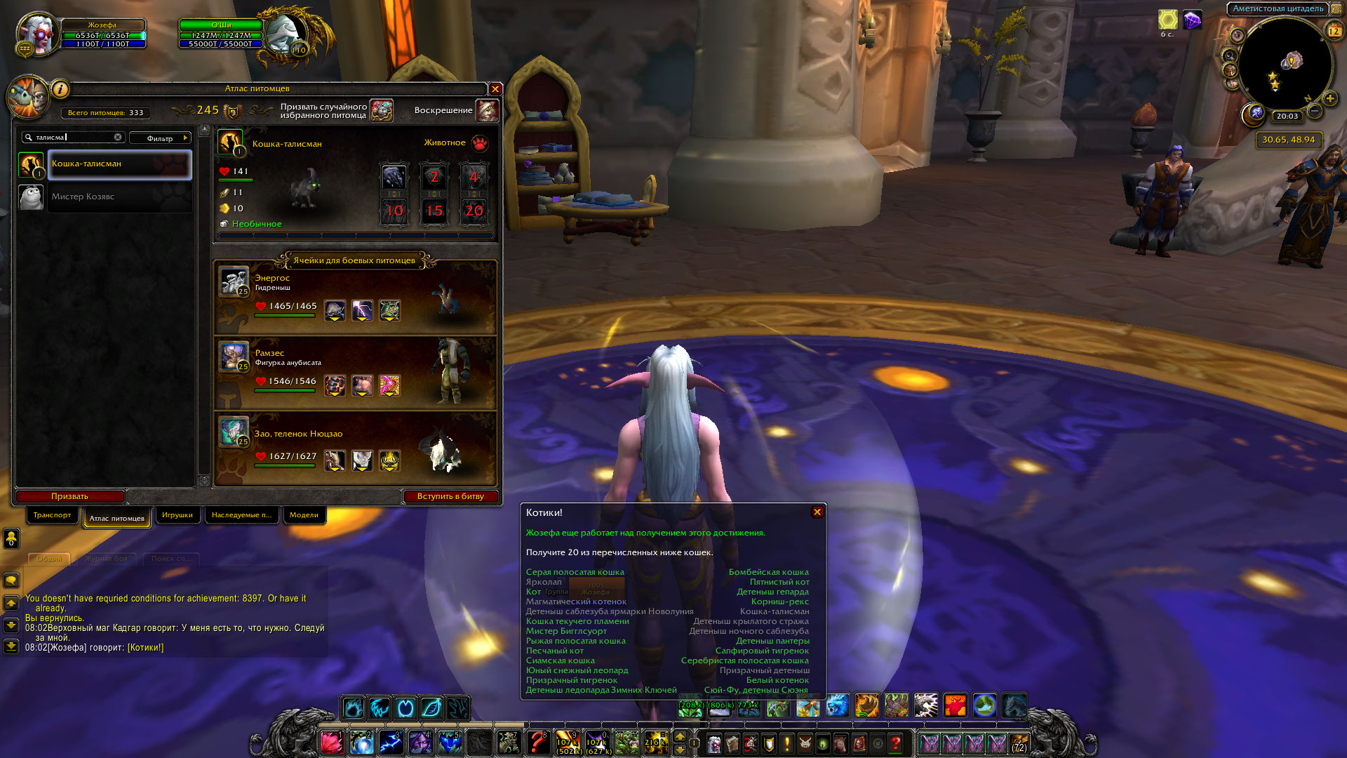 | Description | Выполнял достижение "Котики" (https://ru.wowhead.com/achievement=8397/котики). Суть достижения в наборе 20 котов-спутников из предлагаемого списка, и за их сбор дается достижение и звание. Я собрал нужное количество, однако с одним питомцем, а именно с кошкой-талисман (https://ru.wowhead.com/item=70908/%D0%BA%D0%BE%D1%88%D0%BA%D0%B0-%D1%84%D0%B0%D0%BC%D0%B8%D0%BB%D0%B8%D0%B0%D1%80) возникла проблема. Он у меня имеется, а в списке критериев для для достижения не отображается. Как быть? | ||||