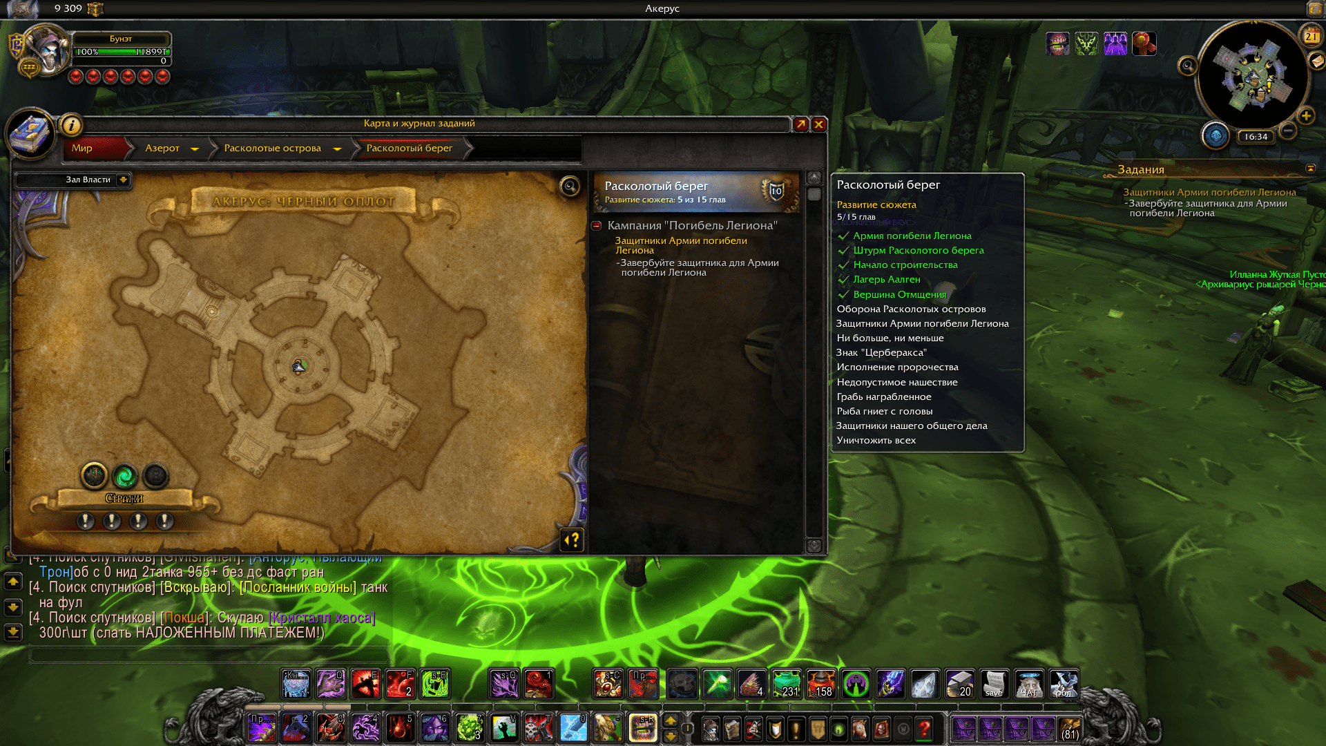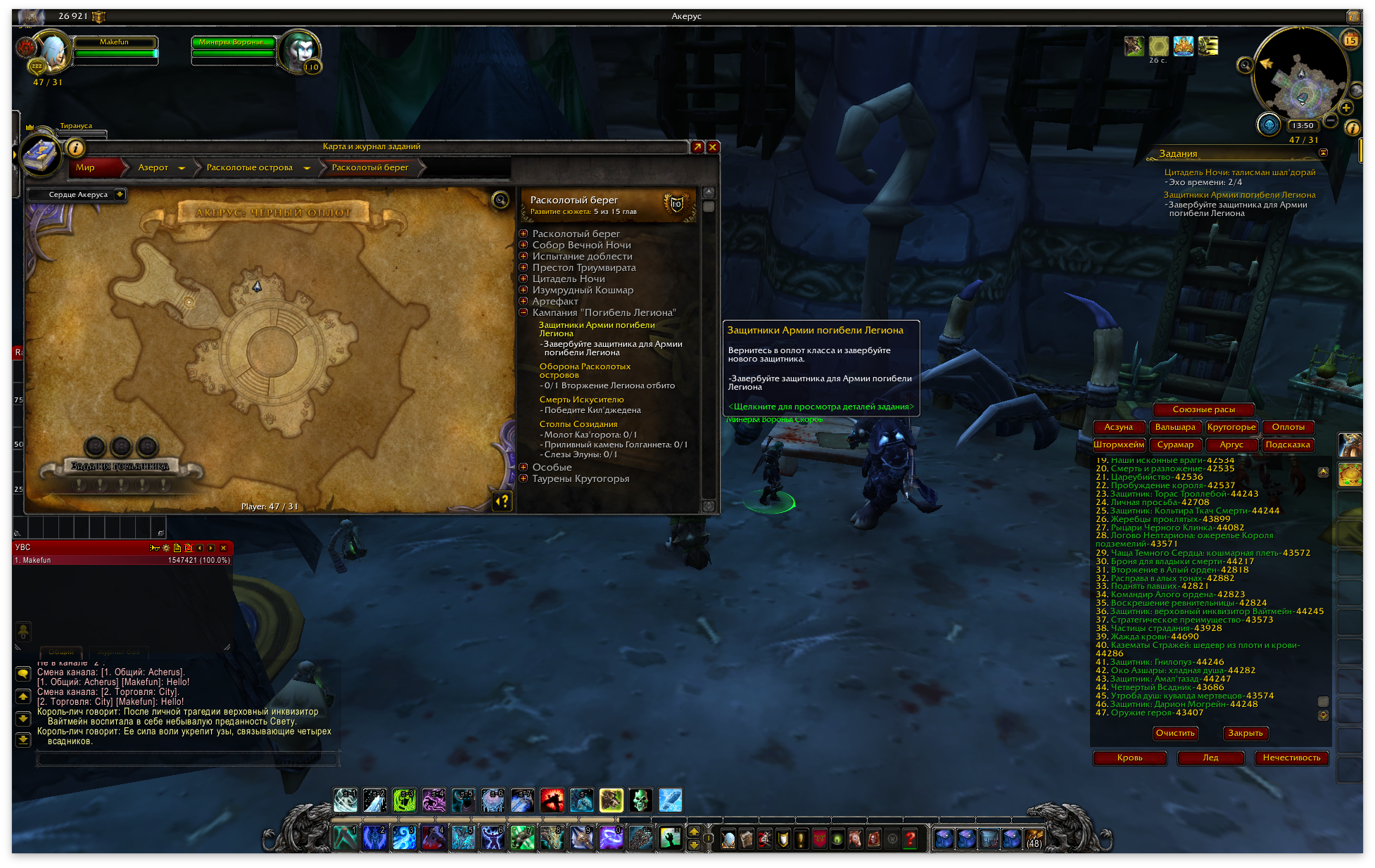 У меня абсолютно аналогичная проблема. Появилась она после переноса персонажа с сервера wowcircle, где у меня была выполнена сюжетка на расколотом берегу. Квест "Защитники Армии погибели Легиона" не возможно выполнить, т.к. сортаники уже все завербованы и соответственно квеста "Явитесь, защитники!" нет. Пробовал исправить квесты через О-ши - не помогает. Снимок экрана (224).png (916,173 bytes) |