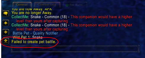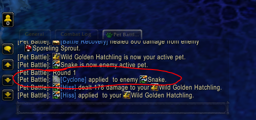 | Steps To Reproduce | Steps for testing Cyclone: Either encounter a battle pet that has the move and uses it on your pet, or get a pet with the ability yourself and then use it. The battle will either end next turn, or continue on for one turn before it closes out on you and in the chat box, it will say in yellow text "Battle failed to be created." See my screenshots for proof that it happens. | ||||