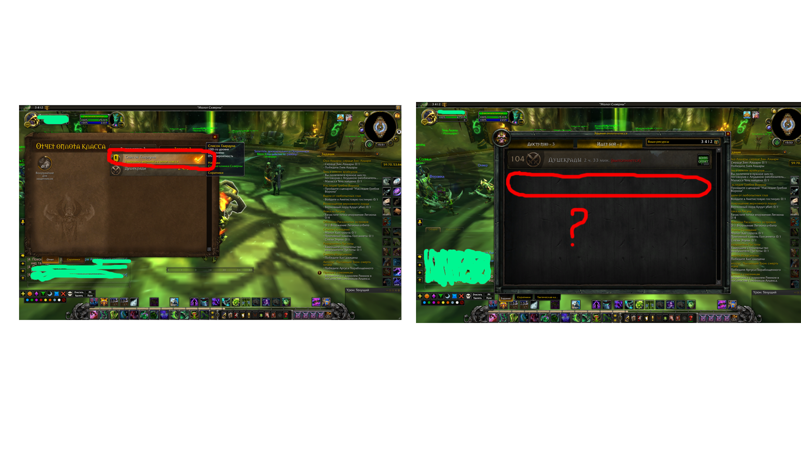 О еще одна жертва доски заданий, посоветую тоже что и другому. Попробуйте установить аддон OrderHallCommander, в нем функция есть насильно закрыть задание выполненное или что то вроде того, лично мне помог разбагать одно задание подобное, может и вам поможет. Попытка не пытка. |