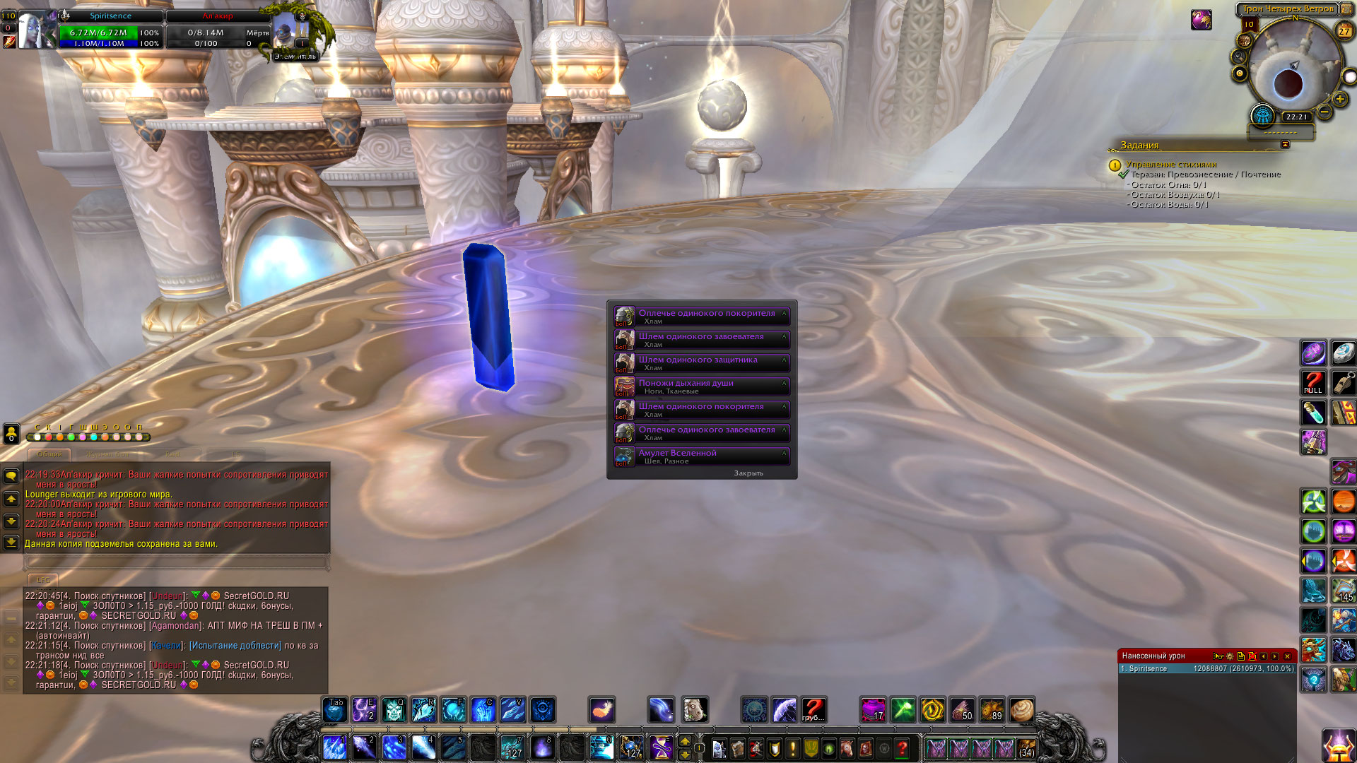 С Алакира в луте отсутствует итем. Точнее не с самого Алакира, а с Сердца ветра, которое появляется после его убийства. Хотя значок лута есть и на самом трупе Алакира, но попасть к нему невозможно из-за невидимой стены. |