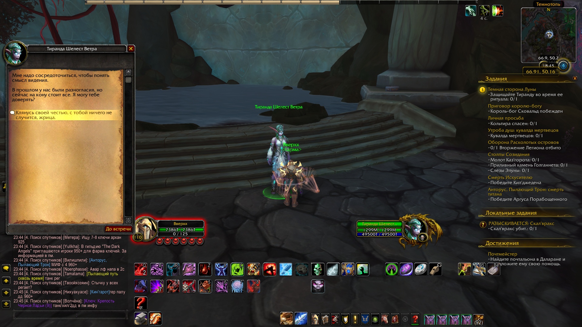 | Description | https://ru.wowhead.com/quest=41890/dark-side-of-the-moon Взял кв, нашел Тиранду у водички, сказал что защищу её. Она проигнорировала и встала столбом. И больше ничего. По идее она должна присесть у водички и на нас должны нападать гарпиимммммм | ||||