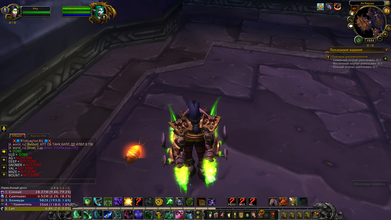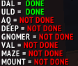теме уже 4 месяца, будут ли правки? кроме того, при проверке выполненных заданий макросом ниже (взят с вовхеда в комментах к маунту), показывает что при выполнении паззла в анкираже он не засчитывается (хоть разлом и появляется). не знаю важно ли это, на всякий упомянул /run local N,t,d={"","ULD","AQ","DEEP","GNOMER","VAL","MAZE","MOUNT"},{47826,47837,47841,47850,47852,47863,47881,47885} for s,k in pairs(N)do d=IsQuestFlaggedCompleted(t[s]) print(k,"=",d and "\124cFF00FF00" or "\124cFFFF0000NOT","DONE")end |