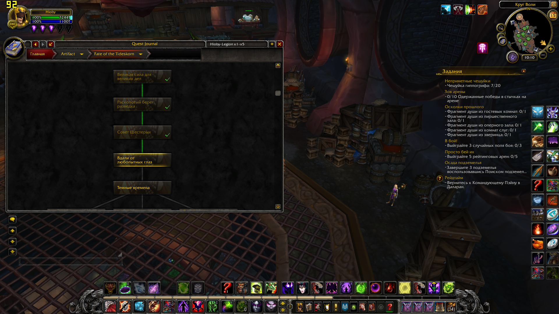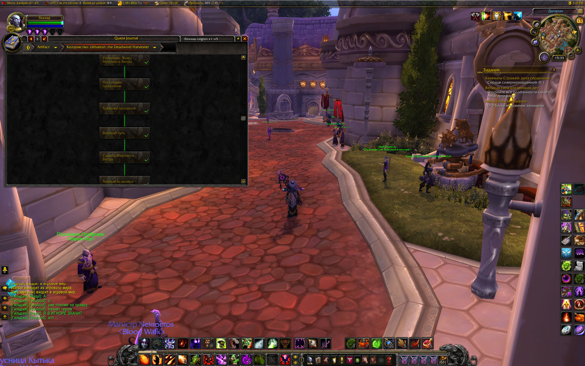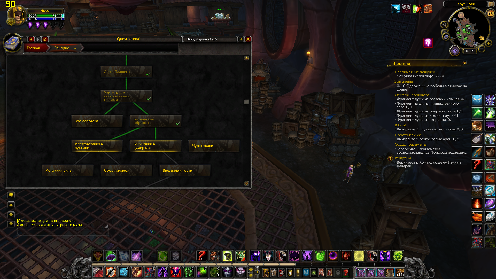 По мессагам: 1) Чернодрев - цепочка на получение дополнительного защитника за выполнение кампании расколотого берега (три Ваших скрина) 2) Судьба Волскорна - цепочка на разблокирование дополнительного набора талантов артефакта, сейчас не сильно актуальна (четыре Ваших скрина) 3) Сердце Света - цепочка оплота , требуется (как то зачем то) для доступа к скрытым обликам артефакта (у меня сделана на одном персонаже на половину, на остальных заброшена) (четыре, нет - пять - Ваших скрина) 4) Внизу Даларана ставятся т.н столпы созидания - Эгида Агграмара из ЧД, Молот Казгорота из Логова Нелтариона и т. д. А из ЦН по квесту после убийства Гулдана надо кв сдавать в Даларане. и манапарда за это дают. 5) а по Аргусу вообще все сразу видно и понятно: стартовая последовательность и три блока сюжетки. Третий блок - путешествие в Пустоши Анторуса не выполнено и не помечено как выполненное. Если нажать на окошко Всадникик откроется цепочка и будет видно на каком квесте застрял. Эпилог у нас реализован. Но не до конца, финальный квест, по которому должен быть разрушен артефакт у нас никогда не будет активен на лайве. Это ответ администратора сервера: У нас не планируется переход на следующее дополнение игры, а значит бессмысленно выполнять квест, который является завершающим перед переходом новое дополнение на оффе. Вопрос с крашами отчета оплота сейчас решается в смежной теме. Ждать читать... "Очень жаль , что мы так и не услышали начальника транспортного цеха..." (с) чуть ниже будут скриншоты из этого аддона с квестами кампании оплота у лока и цепочек артефакта а данные аккаунта светить ни к чему - все равно никто, ни тестеры ни разработчики не будут ими пользоваться. Им это запрещено. Максимум чего в этом плане можно добиться - это чтобы администратор сервера заинтересовался проблемой и скопировал Вашего персонажа к себе на комп. И нашел время посмотреть что и как. Но Ваш случай хоть и тяжелый но тривиальный. С периодичностью появляются запросы от игроков, которые начинали играть чуть ли не на Дреноре, а потом забрасывали это дело и "попадали под лошадь" (с). То есть обновленный оплот конфликтовал с тем ужасом, в котором начинали играть эти смельчаки. И простых методов решения такой проблемы нет. |