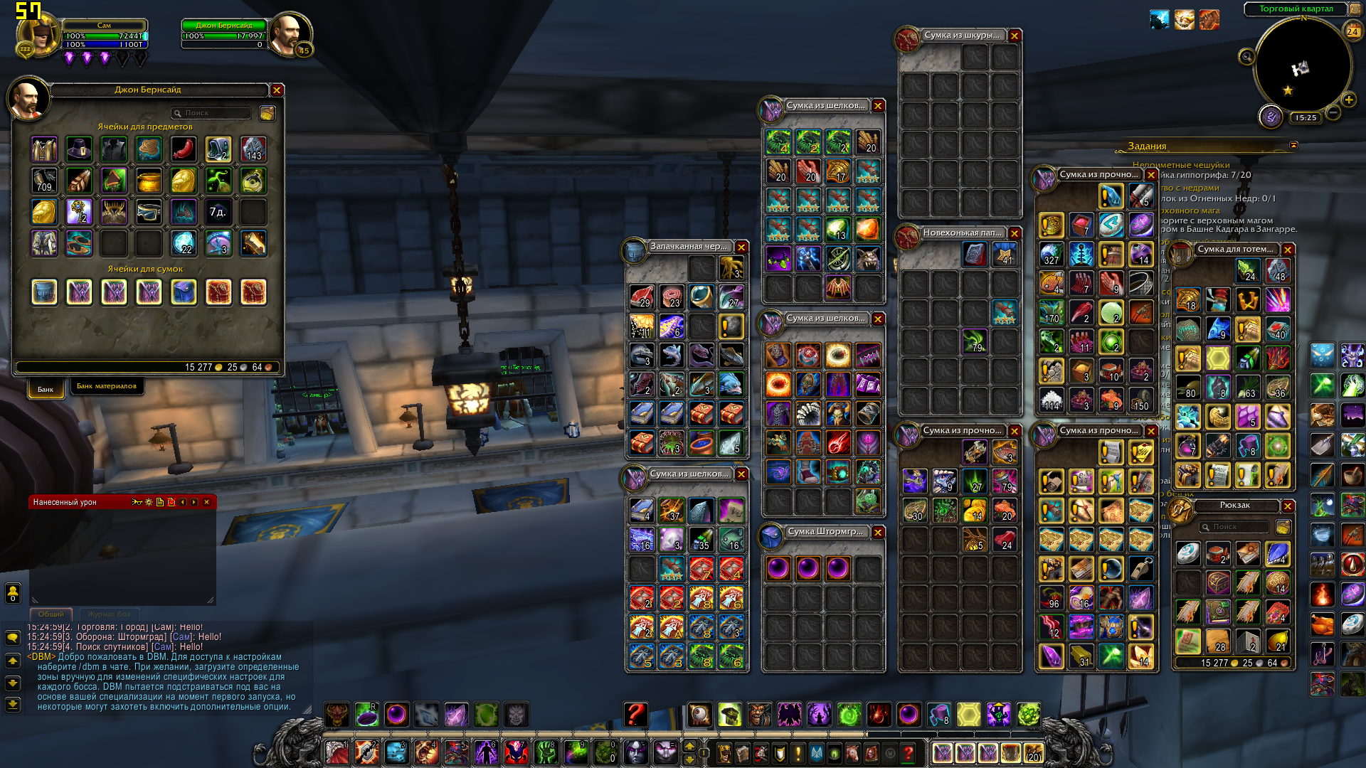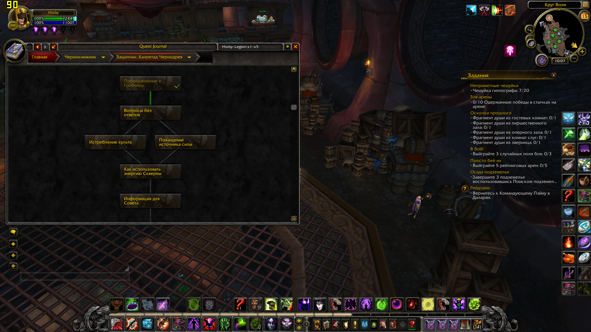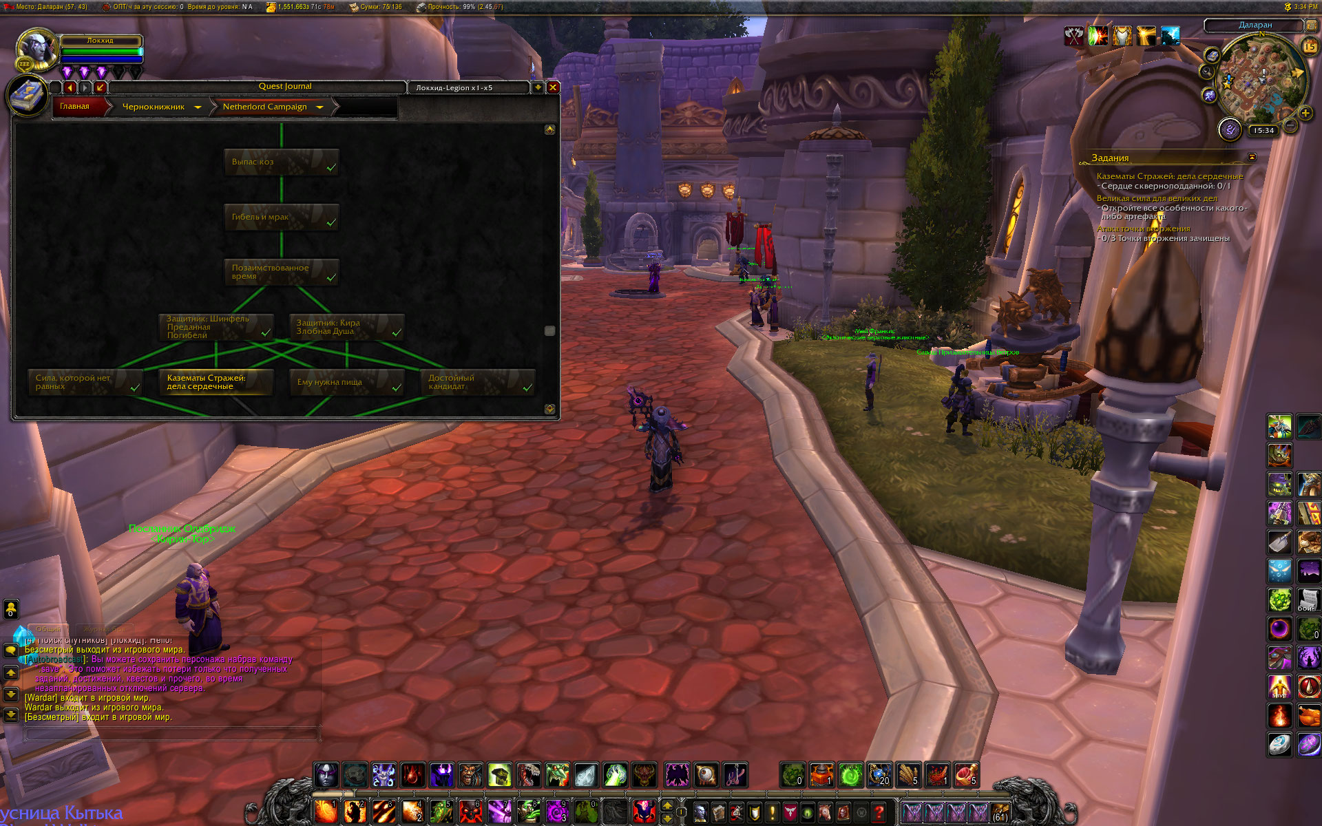 По мессагам: 1) Чернодрев - цепочка на получение дополнительного защитника за выполнение кампании расколотого берега (три Ваших скрина) 2) Судьба Волскорна - цепочка на разблокирование дополнительного набора талантов артефакта, сейчас не сильно актуальна (четыре Ваших скрина) 3) Сердце Света - цепочка оплота , требуется (как то зачем то) для доступа к скрытым обликам артефакта (у меня сделана на одном персонаже на половину, на остальных заброшена) (четыре, нет - пять - Ваших скрина) 4) Внизу Даларана ставятся т.н столпы созидания - Эгида Агграмара из ЧД, Молот Казгорота из Логова Нелтариона и т. д. А из ЦН по квесту после убийства Гулдана надо кв сдавать в Даларане. и манапарда за это дают. 5) а по Аргусу вообще все сразу видно и понятно: стартовая последовательность и три блока сюжетки. Третий блок - путешествие в Пустоши Анторуса не выполнено и не помечено как выполненное. Если нажать на окошко Всадникик откроется цепочка и будет видно на каком квесте застрял. Эпилог у нас реализован. Но не до конца, финальный квест, по которому должен быть разрушен артефакт у нас никогда не будет активен на лайве. Это ответ администратора сервера: У нас не планируется переход на следующее дополнение игры, а значит бессмысленно выполнять квест, который является завершающим перед переходом новое дополнение на оффе. Вопрос с крашами отчета оплота сейчас решается в смежной теме. Ждать читать... "Очень жаль , что мы так и не услышали начальника транспортного цеха..." (с) чуть ниже будут скриншоты из этого аддона с квестами кампании оплота у лока и цепочек артефакта а данные аккаунта светить ни к чему - все равно никто, ни тестеры ни разработчики не будут ими пользоваться. Им это запрещено. Максимум чего в этом плане можно добиться - это чтобы администратор сервера заинтересовался проблемой и скопировал Вашего персонажа к себе на комп. И нашел время посмотреть что и как. Но Ваш случай хоть и тяжелый но тривиальный. С периодичностью появляются запросы от игроков, которые начинали играть чуть ли не на Дреноре, а потом забрасывали это дело и "попадали под лошадь" (с). То есть обновленный оплот конфликтовал с тем ужасом, в котором начинали играть эти смельчаки. И простых методов решения такой проблемы нет. |