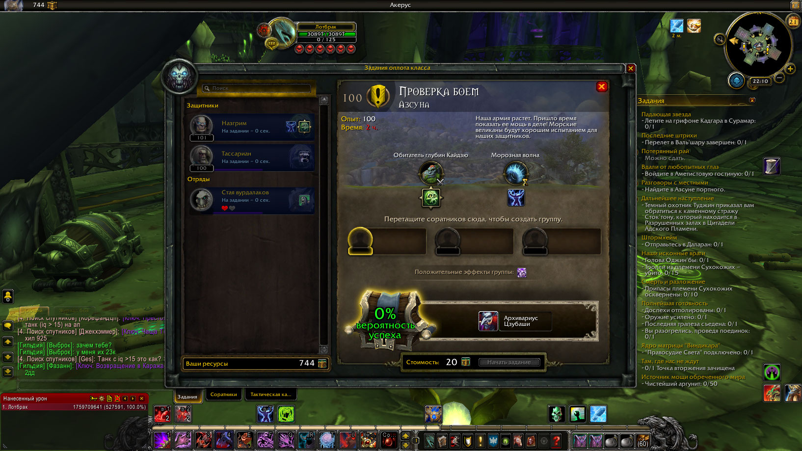 Maksin - есть вопрос: А какие критерии должны быть выполнены, чтобы в оплоте ДК появился НПЦ, который выдает начало цепочки на дополнительного защитника от Армии Погибели Легиона? Цепочка на Расколотом берегу выполнена до момента, когда Майев выдает квест Защитники армии погибели Легиона. В теории, после этого в оплоте должны давать начальный квест цепочки. У меня несколько ДК, кампания оплота специально заморожена на нескольких этапах, вплоть до полного выполнения кампании. Но ни на одном этапе у Могрейна не появляется этот квест. Возможно, если на проблемных персонажах получить этого дополнительного защитника, получится запустить с ним и наемными отрядами миссию повторно. И еще - у всех кто соизволил выложить скрины в списке доступных миссий есть и Саланар всадник и Проверка боем. Какая из миссий должна идти раньше и есть ли взаимное влияние между миссиями на возможность выполнения? У меня на всех ДК такая проблема если и возникала, то задержалась ненадолго - или разбагивалось само или миссия запускалась повторно - по крайней мере улучшения оплота и оба вида наемных отрядов доступны на всех чарах. При фейле миссии она просто выполнялась еще раз. И еще - автоматом подхватывается полученное достижение с самого первого чара "Защитники Армии погибели Легиона" и соответственно, оплот прокачивается полностью независимо от состояния цепочки на конкретном чаре. Так что вариант с прокачкой еще одного чара другого класса - вполне себе может оказаться выходом из ситуации. |