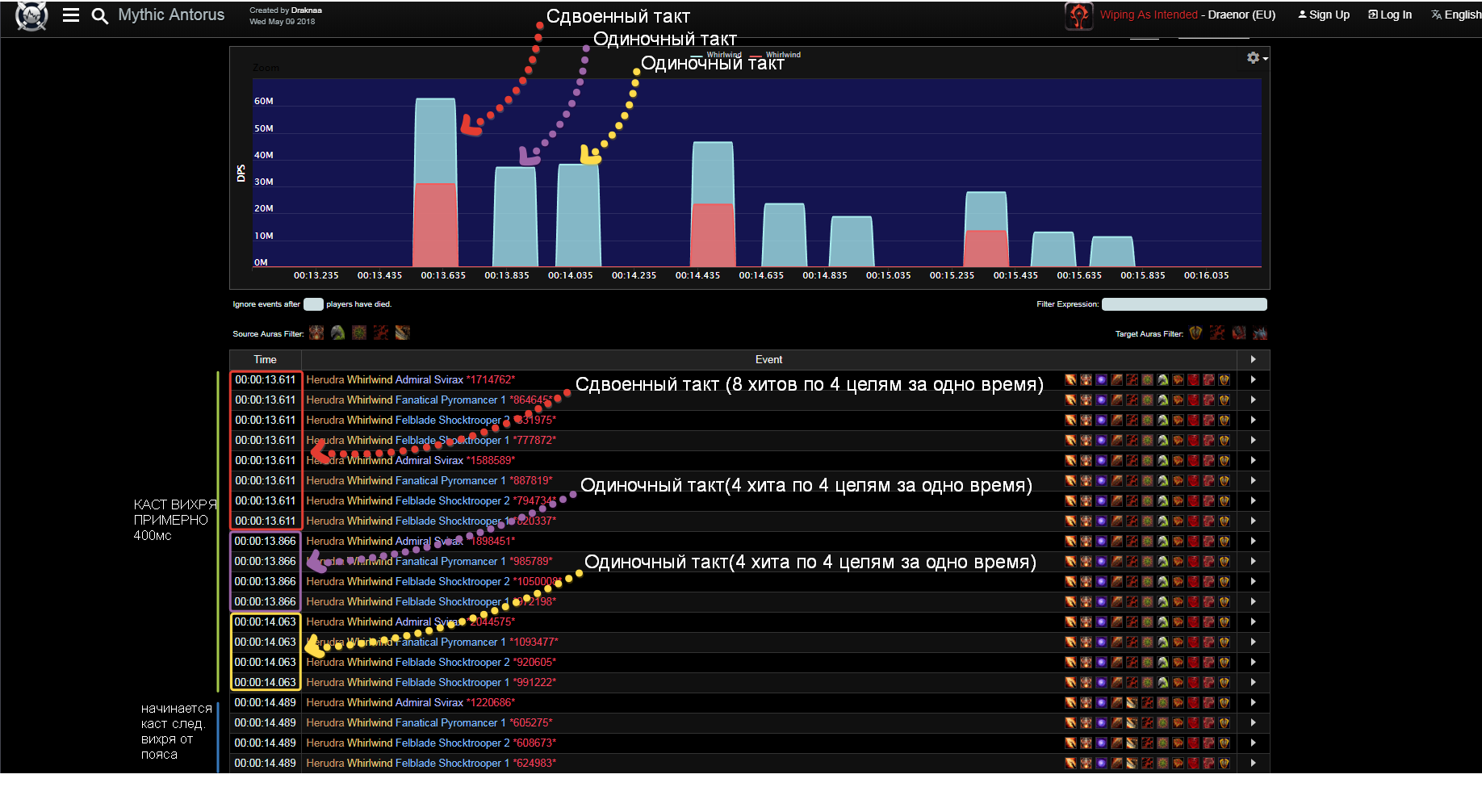 нужна информация как работает по офу 1) через какое время второй вихрь юзается? 2) что будет если давать два вихря подряд? тики теряются потому, что время жизни https://ru.wowhead.com/spell=227201 , 800 мс сам вихрь всемя тактами кастится за 400мс (0-200-400) второй вихрь кастится через 800мс, однако чтобы не попасть в режим зацикливания кастов (это когда начинается спам вихрей) он не может быть чаще 1200мс, тоесть, если применить вихрь , если у вас гкд на вихре меньше 1200мс, то при использовании его если вы пересечете таймер быстрее 1200мс, вы не дадите завершиться триггерящемуся вихрю, потеряя тем самым пару тактов |