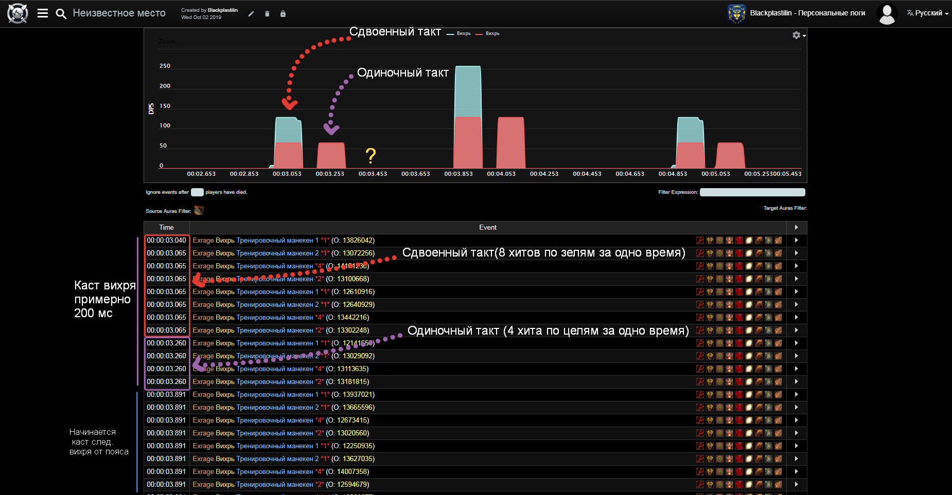 Сейчас ситуация стала с одной стороны немного лучше,а с другой стороны чуть-чуть непонятнее Порылся в логах с оффы,записал собственные и нашел еще пару вещей,которые у нас не идентичны ---------------------------------------------------------------------------------------------------------------------------------------------------------------------------------------------------------------------------------------------- https://www.warcraftlogs.com/reports/GHVb9QAkBXpmc4nY#fight=18&type=damage-done&source=4&view=events&ability=-1680&start=5325323&end=5328496 Это лог с оффы на Военном совете анторуса,воин использует https://ru.wowhead.com/item=137087,лог на 4 цели ---------------------------------------------------------------------------------------------------------------------------------------------------------------------------------------------------------------------------------------------- https://ru.warcraftlogs.com/reports/RPJzFf7T4Zt9WdwG/#fight=last&type=damage-done&source=1&ability=-1680&view=events&start=20232048&end=20235049 Это мой лог в 4 манекена в штормграде (пришлось запариться чтобы стянуть их в одно место) тест проводился при разгоне хасты и тем самым уменьшением гкд чтобы проверить потерю попаданий ,из-за этого случились некоторые аномалии(можно заметить что где-то в середине дубликат вихря и основной забагались из-за ГКД и соединились в один) ---------------------------------------------------------------------------------------------------------------------------------------------------------------------------------------------------------------------------------------------- если обратить внимание на таймкоды и диаграммы,то можно заметить самое первое и ключевое отличие:На оффе с поясом вихрь дает 4 такта(первые два проходят в одно время,третий примерно через 200 мс и четвертый примерно через 400 мс) А у нас их 3(первые два проходят в одно время,третий через 200 мс,а четвертый просто отсутствует) К слову до фикса было немного по-другому (Происходил первый такт(Не сдвоенный!) затем через 200 мс происходил второй и через 400 мс происходил третий(четвертого не было!)То есть вихрь кастился за 400 мс,но это было все равно 3 такта,просто за длительное время) После изменений ситуация стала следующей,в вихре все еще 3 такта,но теперь он кастится быстрее,за 200 мс Но если разгонять хасту тики все равно теряются,на оффе такого не происходит потому что время жизни https://ru.wowhead.com/item=137087 не 600 мс,а оно динамично,это можно увидеть если взять все тот же лог с Военного совета Анторуса и сравнить его с логом война в оке азшары на треше (Главное отличие этих логов в том,что у Война на Совете ГКД гораздо меньше чем у второго Война в Оке Азшары) ---------------------------------------------------------------------------------------------------------------------------------------------------------------------------------------------------------------------------------------------- https://www.warcraftlogs.com/reports/GHVb9QAkBXpmc4nY#fight=18&type=damage-done&source=4&view=events&ability=-1680&start=5325323&end=5328496 Лог война с Совета ---------------------------------------------------------------------------------------------------------------------------------------------------------------------------------------------------------------------------------------------- https://www.warcraftlogs.com/reports/gwdmfXKRaVHzA3yj#fight=3&type=damage-done&source=3&ability=-1680&start=626616881&end=626620125&view=events Лог война с Ока АЗшары ---------------------------------------------------------------------------------------------------------------------------------------------------------------------------------------------------------------------------------------------- в этих отрезках логов видно что войны сдают http://ru.wowhead.com/spell=1680 ,у первого Вара пояс дублирует http://ru.wowhead.com/spell=1680 спустя 426 мс и после прохождения каста от пояса(400 мс) он дает http://ru.wowhead.com/spell=1680 еще раз и каст происходит через 419 мс ,а у второго вара пояс дублирует http://ru.wowhead.com/spell=1680 спустя 729 мс и после прохождения каста от пояса(400 мс) он дает http://ru.wowhead.com/spell=1680 еще раз и каст происходит через 736 мс (Судя по всему касты встают в очередь,они не отменяют друг друга как у нас) По итогу,можно сделать вывод ч