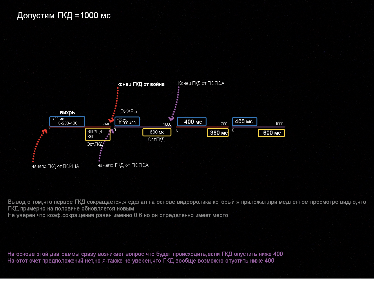 Нет,он должен произноситься через время,просто это время должно равняться оставшемуся ГКД Война,то есть так Воин дает Вихрь,одновременно с этим запускается ГКД,вихрь проходит за 400мс,дальше происходит завершение ГКД и запускается еще один каст Вихря с пояса то есть 400+оставшееся ГКД+400, и снова я полез серчить все логи и БИНГО нашел нужный момент https://www.youtube.com/watch?v=-a1etGgTpHY& Если в этом ролике во время файта на 18:05 обратить внимание на каст панель война,то можно увидеть, что у него дубликат вихря от пояса тоже вызывает ГКД(он жмет на кнопку вихря,начинается откат по ГКД,и где-то на половине или ближе к концу у него таймер ГКД снова обновляется,хотя он сам ничего не нажимал,он бы банально не успел бы ничего нажать,значит это ГКД запускает его легендарка,которая дает вихрь) А значит что каст должен выглядеть примерно так "Собственный каст вара 400мс+оставшеесяГКД(но судя по-всему оно не полное,где-то 3/5 от оставшегосяГКД)+Каст вихря с пояса 400мс + оставшееся ГКД(которое уже тригерит не сам вар а легендарный пояс) Допустим,наше ГКД будет равно 1000мс,тогда 400мс +(600*3/5)мс +400мс+600мс и так по кругу или формула чуть проще для восприятия "ВИХРЬ ОТ ВАРА +(600*3/5)мс + ВИХРЬ ОТ ПОЯСА +600мс"и так по кругу или формула еще чуть проще "ВИХРЬ ОТ ВАРА +(оставшеесяГКД*3/5)+ВИХРЬ ОТ ПОЯСА +оставшеесяГКД" и так по кругу Это значит что у нас вихрь начинает пропадать,накладываться и отменять сам себя просто потому ,что каст от пояса не вызывает ГКД http://egammi.net/image/SZM7 2019-10-03_15-46-52.png (827,431 bytes) |