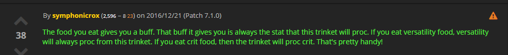 Olex228 а самому почитать комменты на вовхеде сложно? первый же коммент https://www.wowhead.com/item=142168/majordomos-dinner-bell?bonus=1826:1468 От symphonicrox (2,596 – 8·23) 2016-12-21 (Обновление 7.1.0) The food you eat gives you a buff. That buff it gives you is always the stat that this trinket will proc. If you eat versatility food, versatility will always proc from this trinket. If you eat crit food, then the trinket will proc crit. That's pretty handy! |