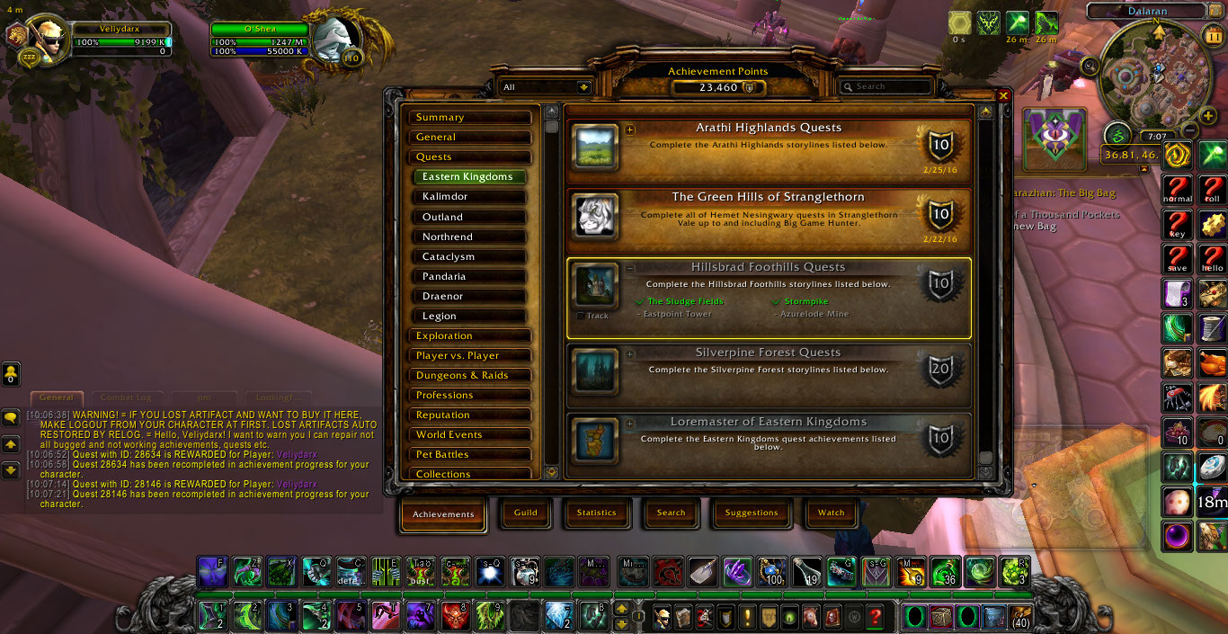 | Description | Ачив https://ru.wowhead.com/achievement=4895 Критерии: Восточная башня и Лазуритовый рудник не засчитываются при выполнении заданий https://ru.wowhead.com/quest=28634 (28634) и https://ru.wowhead.com/quest=28146 (28146) Перезачет у npc также без результата | ||||