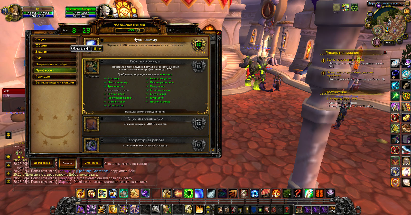 Здравствуйте вы не верно указали категорию тему выбрав раздел "1" , по этому так долго не было ответа. Мне только вчера передали вашу тему. http://tracker.legionbugs.com/view.php?id=3972 решена http://tracker.legionbugs.com/view.php?id=4134 решена на счет достижения https://ru.wowhead.com/achievement=4860 вы должны сперва прокачать репутацию с гильдией, а затем качать профессию. |