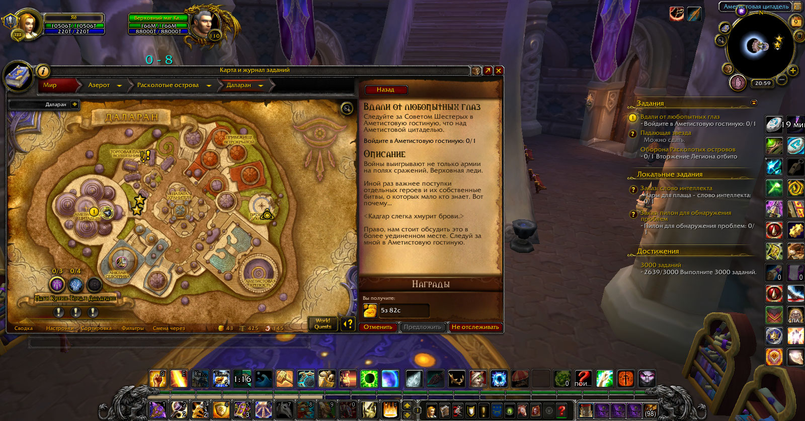 Уже работает, спасибо. Но есть новая проблема. После того как НПС переместились наверх, в Аметистовую гостинную, все квесты (на доп. талы, облики и т.д.) также нужно сдавать внизу, в Аметистовой цитадели, где НПС уже нет, поскольку они находятся в другой фазе. Или после того как починят https://ru.wowhead.com/quest=44821/%D1%82%D0%B5%D0%BC%D0%BD%D1%8B%D0%B5-%D0%B2%D1%80%D0%B5%D0%BC%D0%B5%D0%BD%D0%B0#videos-english всё будет нормально? |