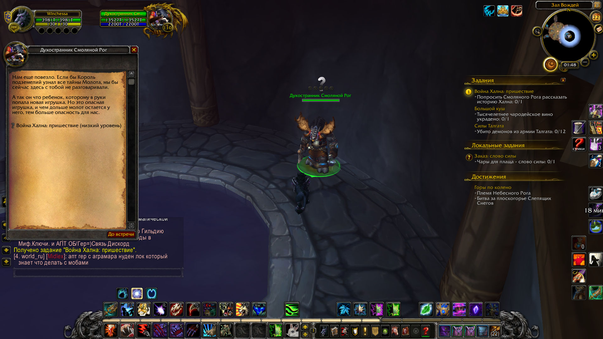 | Description | 1. Задание - Война Хална: пришествие 2. Нет диалога у Духостранник Смоляной Рог В дальнейшем должно перекидывать в старую Азшару для выполнения квеста. 3. Должен быть диалог и телепорт. | ||||