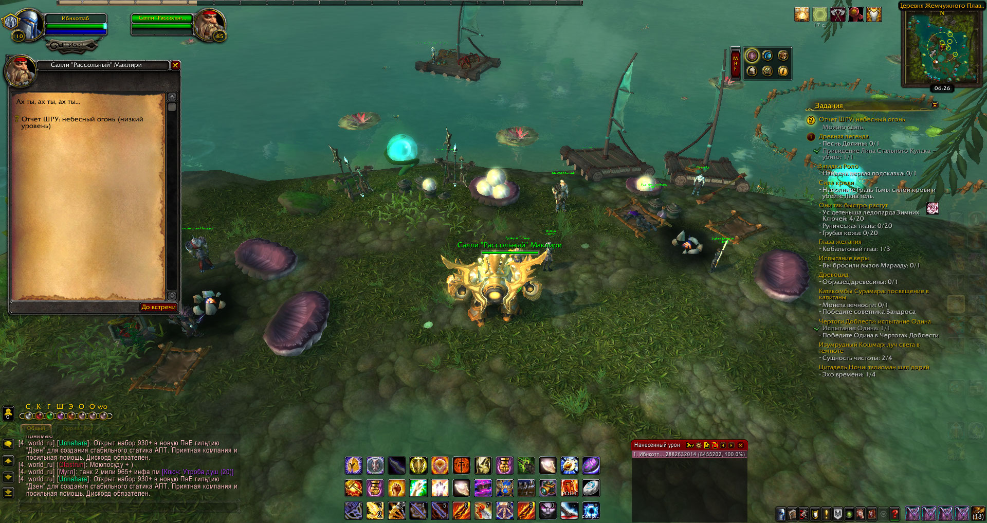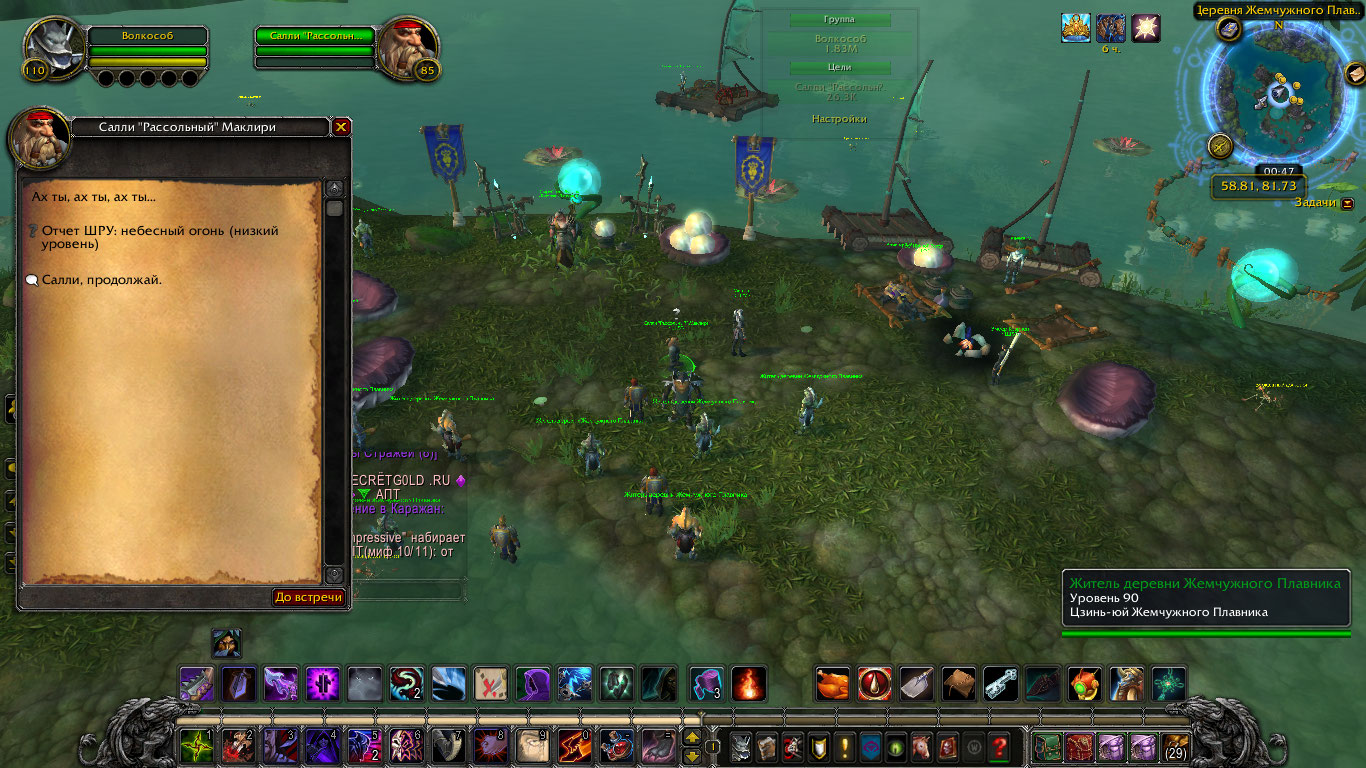 У меня сложная ситуация, NPC https://ru.wowhead.com/npc=55282/салли-рассольный-маклири стоит в деревне жемчужного плавника, даёт квест, при взаимодействии с NPC есть выбор "Салли, продолжай", но ничего не происходит, квест не засчитывается, сдать нельзя. Переотменял, брал заново, менял локации, возвращался снова. Результат отрицательный. WoWScrnShot_060920_004700.jpg (310,628 bytes) |