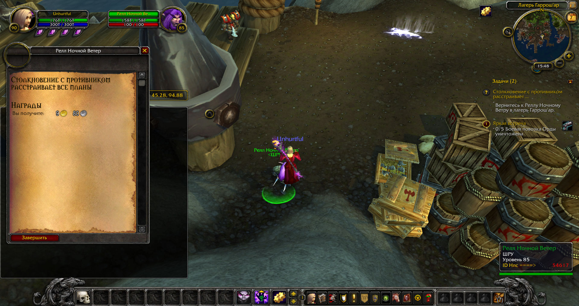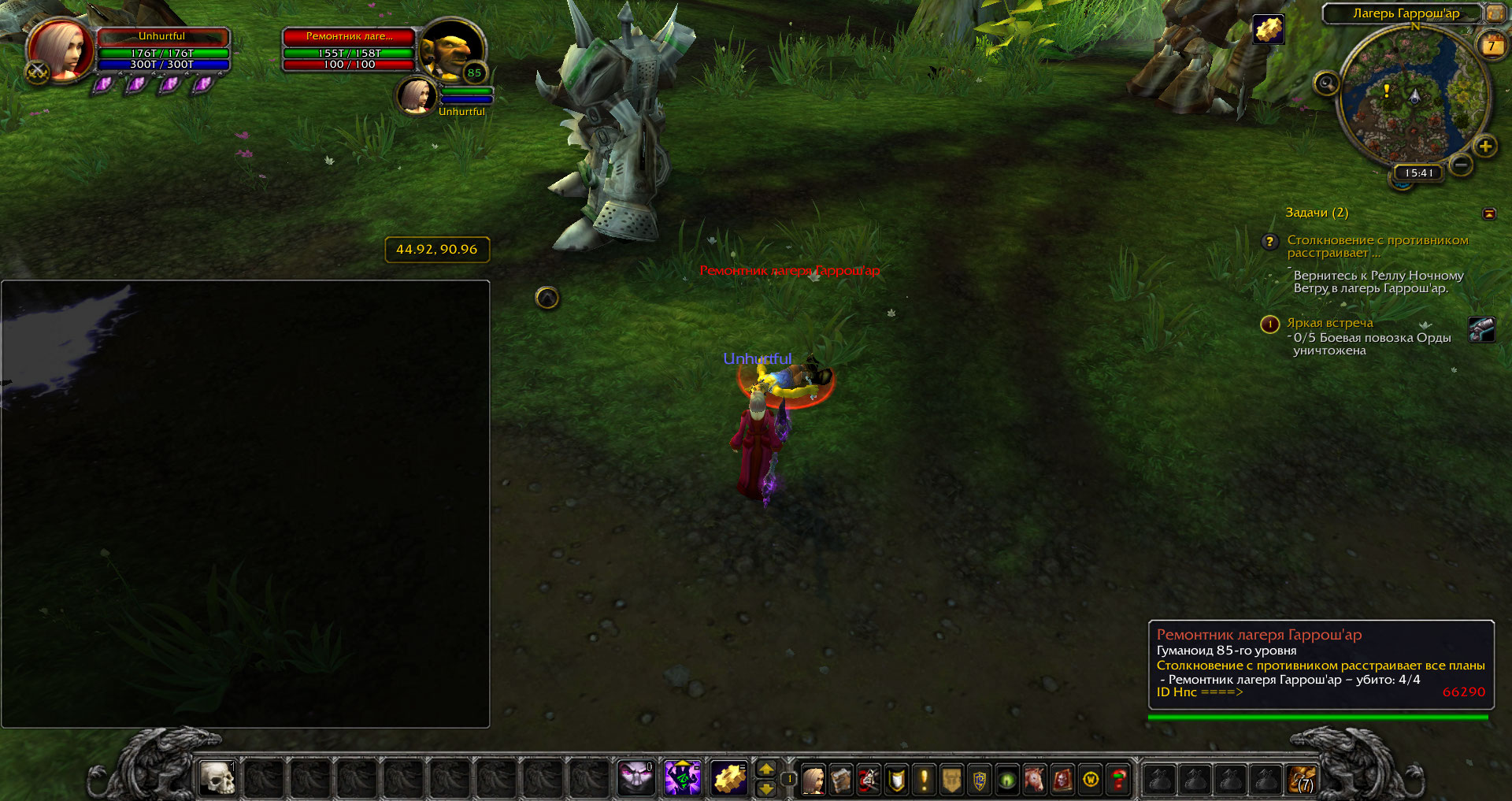 | Description | https://ru.wowhead.com/quest=30069 1) https://ru.wowhead.com/npc=66290 должны бегать по территории, где выполняется квест. У нас же они лежат на земле с полным хп и не бьют игрока даже при входе в бой. 2) при сдаче квеста отображается пустое окошко | ||||