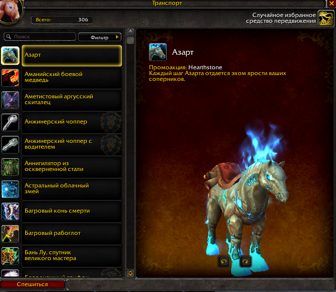 Здравствуйте, "Последняя известная дата, когда можно было получить ачив и награду - 13.10.2015 в обновлении 6.2.2." Конь и ачив давались за действия в игре Hearthstone. На нашем сервере маунта можно получить Постоянные награды за проведенное время в игре: 2500 часов - https://ru.wowhead.com/item=98618/%D0%B0%D0%B7%D0%B0%D1%80%D1%82 Ачив у нас на сервере не выдают. |
