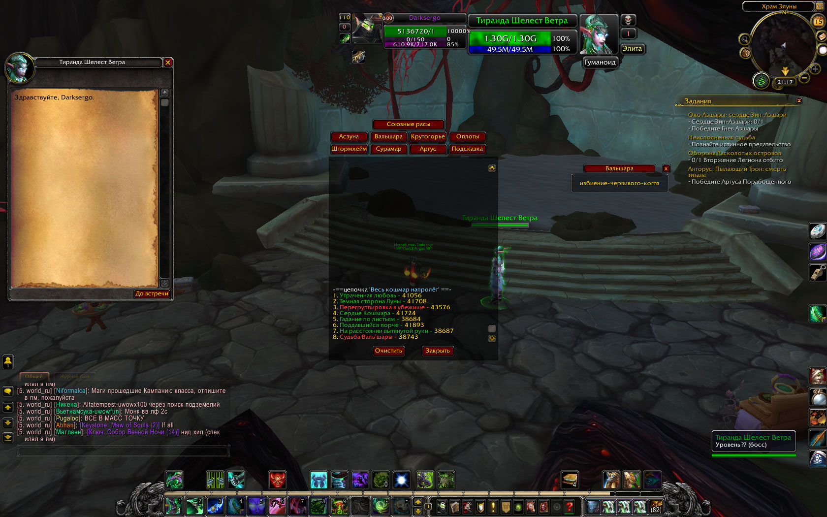 где скрины с доказательствами того, что сюжетные цепочки пройдены полностью в Азсуне? в то же время, за сегодняшний день в чате видел вопросы по поводу квеста судьба Вальшары и мертвой Изеры минимум от четырех игроков с уШОШ. ТАк что проверить https://ru.wowhead.com/quest=38743/%D1%81%D1%83%D0%B4%D1%8C%D0%B1%D0%B0-%D0%B2%D0%B0%D0%BB%D1%8C%D1%88%D0%B0%D1%80%D1%8B необходимо. |