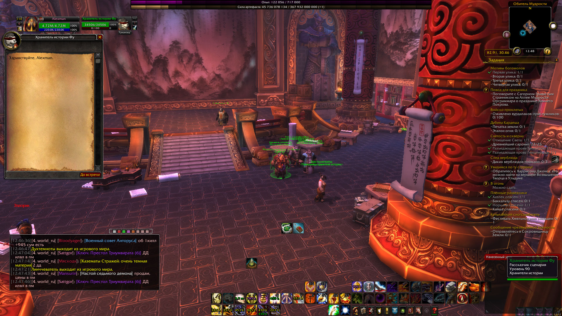 Комментарии wowhead.com: Над Дворцом Могу'шан в Обители Мудрости находится 3 хранителя истории. https://ru.wowhead.com/npc=78709/хранитель-истории-фу https://ru.wowhead.com/npc=78777/хранитель-истории-шинь и https://ru.wowhead.com/npc=80633/хранитель-истории-хань Когда игроки достигают 91 уровня, эти npc могут предоставить доступ к очередям поиска рейдов, обычных и героических сценариев Пандарии. https://ru.wowhead.com/npc=78709/хранитель-истории-фу предоставляет доступ к очередям обычных сценариев: https://ru.wowhead.com/zone=6209/нефритовый-лес (Сценарий: Деревня Зеленой Скалы) https://ru.wowhead.com/zone=6309/унга-ингу (Сценарий: Унга-Ингу) https://ru.wowhead.com/zone=6208/гробница-забытых-королей (Сценарий: Гробница Забытых Королей) https://ru.wowhead.com/zone=6219/арена-истребления (Сценарий: Арена Истребления) https://ru.wowhead.com/zone=6101/хмельная-буря (Сценарий: Хмельная буря) https://ru.wowhead.com/zone=6426/фестиваль-хмельнолуния (Сценарий: Фестиваль Хмельнолуния) https://ru.wowhead.com/zone=6040/пылевые-топи (Сценарий: Падение Терамора, Орда) https://ru.wowhead.com/zone=6500/пылевые-топи (Сценарий: Падение Терамора, Альянс) https://ru.wowhead.com/zone=6328/атака-на-занвесс (Сценарий: Атака на Зан'весс) https://ru.wowhead.com/zone=6565/кинжал-во-тьме (Сценарий: Кинжал во тьме) https://ru.wowhead.com/zone=6616/немного-терпения (Сценарий: Немного терпения) https://ru.wowhead.com/zone=6615/красарангские-джунгли (Сценарий: Крепость Покорителей) https://ru.wowhead.com/zone=6567/битва-в-открытом-море (Сценарий: Битва в открытом море) https://ru.wowhead.com/zone=6733/вечноцветущий-дол (Сценарий: Темное сердце Пандарии) https://ru.wowhead.com/zone=6731/секреты-огненной-пропасти (Сценарий: Секреты Огненной Пропасти) https://ru.wowhead.com/zone=6678/дун-морог (Сценарий: Кровь на снегу) https://ru.wowhead.com/npc=78777/хранитель-истории-шинь предоставляет доступ к очередям героических сценариев: https://ru.wowhead.com/zone=6567/битва-в-открытом-море (Сценарий: Битва в открытом море) https://ru.wowhead.com/zone=6733/вечноцветущий-дол (Сценарий: Темное сердце Пандарии) https://ru.wowhead.com/zone=6731/секреты-огненной-пропасти (Сценарий: Секреты Огненной Пропасти) https://ru.wowhead.com/zone=6678/дун-морог (Сценарий: Кровь на снегу) https://ru.wowhead.com/zone=6101/хмельная-буря (Сценарий: Хмельная буря) https://ru.wowhead.com/zone=6208/гробница-забытых-королей (Сценарий: Гробница Забытых Королей) https://ru.wowhead.com/npc=80633/хранитель-истории-хань предоставляет доступ к очередям рейдов: https://ru.wowhead.com/mogushan-vaults (Стражи Могу'шан, Подземелья Могу'шан, часть 1) https://ru.wowhead.com/mogushan-vaults (Хранилище тайн, Подземелья Могу'шан, часть 2) https://ru.wowhead.com/heart-of-fear (Надвигающийся ужас, Сердце Страха, часть 1) https://ru.wowhead.com/heart-of-fear (Кошмар Шек'зир, Сердце Страха, часть 2) https://ru.wowhead.com/terrace-of-endless-spring (Терраса Вечной Весны) https://ru.wowhead.com/throne-of-thunder (Последний оплот зандаларов, Престол Гроз, часть 1) https://ru.wowhead.com/throne-of-thunder (Забытые глубины, Престол Гроз, часть 2) https://ru.wowhead.com/throne-of-thunder (Залы Искажения Плоти, Престол Гроз, часть 3) https://ru.wowhead.com/throne-of-thunder (Вершина Бурь, Престол Гроз, часть 4) https://ru.wowhead.com/siege-of-orgrimmar (Вечноскорбящий дол, Осада Оргриммара, часть 1) https://ru.wowhead.com/siege-of-orgrimmar (Расплата у врат, Осада Оргриммара, часть 2) https://ru.wowhead.com/siege-of-orgrimmar (Подземная крепость, Осада Оргриммара, часть 3) https://ru.wowhead.com/siege-of-orgrimmar (Низвержение, Осада Оргриммара, часть 4) https://www.wowhead.com/npc=80633/lorewalker-han#comments:id=2295963 (ссылка на комментарий на английском языке) |