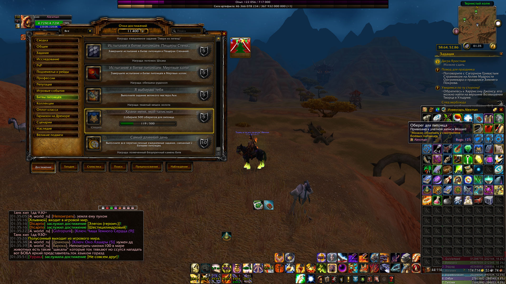 | Description | https://ru.wowhead.com/achievement=9712 неправильно считает в сумке 125 в ачиве 119, да и я питомцев всех улучшал за обереги | ||||