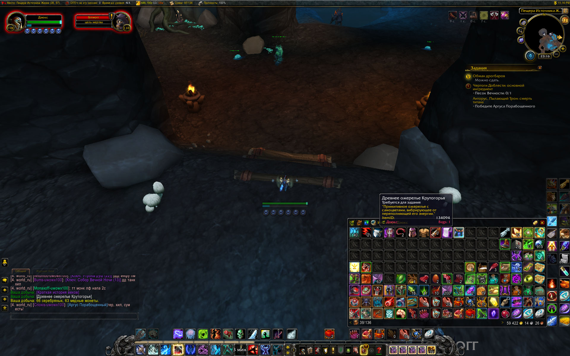 В общем так. Добрался я и до этого бага. И вот что я вам всем скажу. При наличии указанного квеста нужный моб имеет правильный ИД, подсвечивается как квестовый и имеет в тултипе надпись насчет ожерельки 0/1. Но если начать его убивать, приходит (писец) Даргрул, станит всех и восстанавливает мобу ХП. То есть отрабатывает микроивент от квеста Кристальная ярость. После этого, если убить моба дропа нет совершенно. Но если зергануть моба и убить его до того как придет (писец) Даргрул - все нормально, есть разноплановый дроп - пара кусков шелка, серые фиговины и квестовое ожерелье. Скриншот прилагаю. Предлагается проверить мое предположение и если все так и есть - исправить ситуацию. Далеко не все классы способны снести 10кк ХП за 2 секунды. |