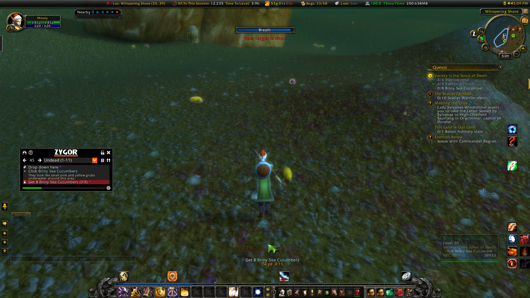 Clicking on https://www.wowhead.com/npc=38933/briny-sea-cucumber does not drop https://www.wowhead.com/item=52068/briny-sea-cucumber. When you click on it, you get the message: "Your target is dead". WoWScrnShot_051920_190932.jpg (366,349 bytes) |