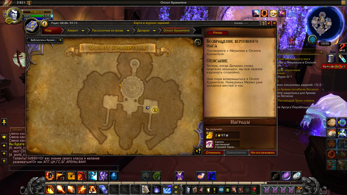 | Description | кв возвращение верховного мага не могу сдать, не та фаза в оплоте, нужный нпц валяется на кроватке, без этого я не могу закончить цепочку на мага | ||||