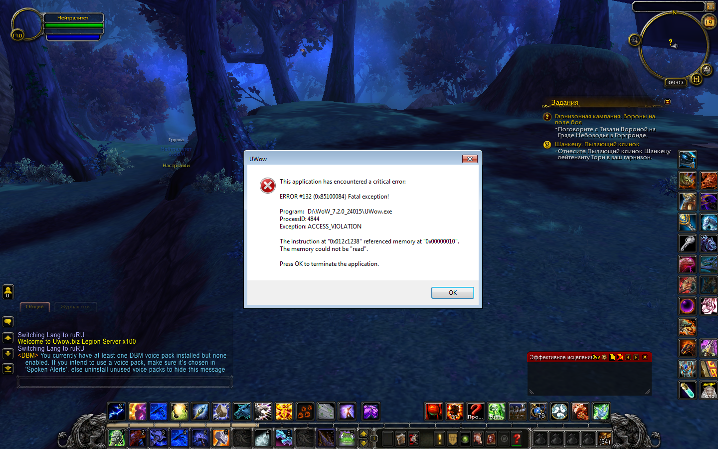 Беда беда. Судя по скрину Вам не составит труда проверить сначала железо - память потестировать, жесткий диск на ошибки. Вирусы вряд ли, а вот какая то программа запущенная параллельно может мешать. почистить кеш, удалить папку /WTF , оставив в ней только файл epicwow.wtf или uwow.wtf , в нем настройки на коннект к серверу. проверить клиент лаунчером, если его используете. Если не используете лаунчер или не поможет - зайти на http://s2.torrentu.biz/cdn/ сравнить имеющиеся файлы клиента с тем, что лежит на ресурсе, может быть скачать все файлы заново. Еще взять в этой теме файл info и сравнить/заменить http://tracker.legionbugs.com/view.php?id=7610 Хотя кто знает, после рестарта должны были залить правки по гарнизону альянса, может это они так влияют. На Альянсе гарнизон проверить не чем. |
