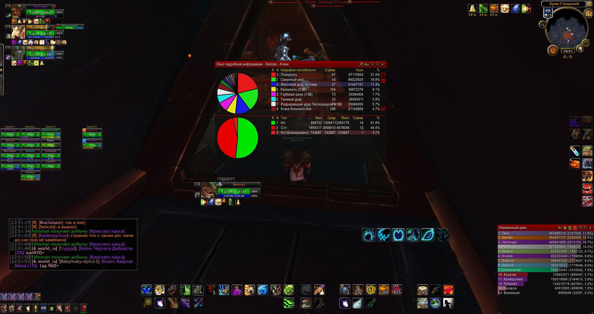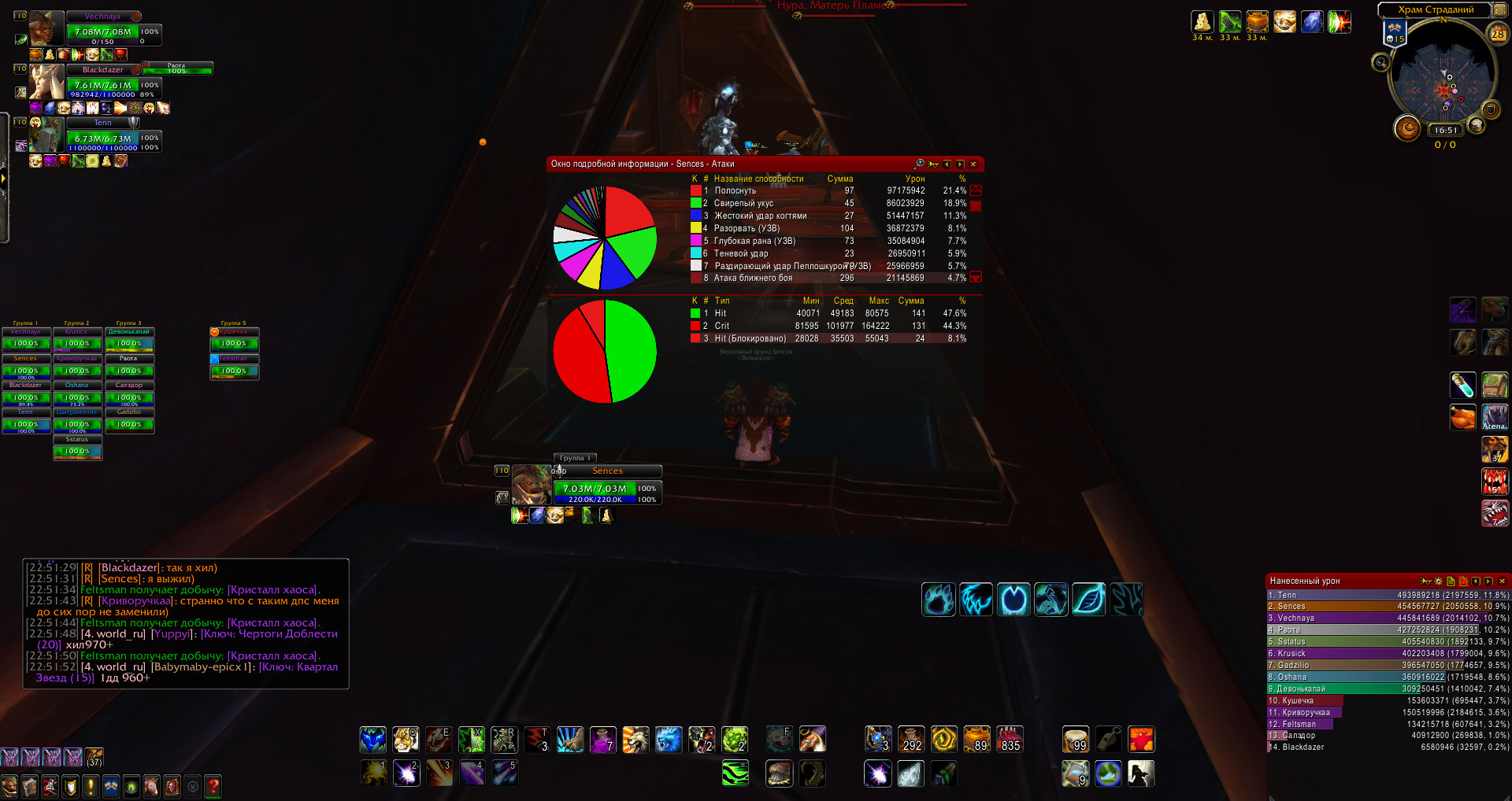 ну и немного пруфов по миссам тут https://wow.gamepedia.com/Hit with dual-wielding: 24% + (Mob Level - Your Level) * 0.5% конечно есть дренорский фикс All characters now have a 100% chance to hit, 0% chance to be dodged, 3% chance to be parried, and 0% chance for glancing blows, when fighting creatures up to 3 levels higher (bosses included). но однако этот фикс отвечает только за стандартные 5% промахов(When a player or mob attacks a player, the base miss rate is 5%), а не за штраф накладываемый на парное оружие(if a player is Dual Wielding, they inherit an additional 19% miss chance.) пруфы из логов, например фдк https://www.warcraftlogs.com/reports/4Pfw3ckDqYMQH62T#fight=23&type=damage-done&source=8 смотрим на строчку Melee и видим там Miss% 20.47% и это при 19% базы(рандом такой рандом) теперь к энху https://www.warcraftlogs.com/reports/yQKNYmawFWtzTHkg#fight=5&type=damage-done&source=23 - 16.03% далее дх https://www.warcraftlogs.com/reports/QwyLPGFDkYJChRHN#fight=17&type=damage-done&source=12 - 14.23%(при этом по тени вариматраса у него вообще 25% миссов) теперь тсв монк https://www.warcraftlogs.com/reports/PjNpBfcrVmYLb6yW#fight=15&type=damage-done&source=9 - 16.52% мутик https://www.warcraftlogs.com/reports/q7mz4fFHanbAdGLh#fight=10&type=damage-done&source=15 - 21.48% шд https://www.warcraftlogs.com/reports/NwAVF3WYCxnLJQXd#fight=33&type=damage-done&source=1 - 17.54% пират https://www.warcraftlogs.com/reports/KAhYGTfjHbF4RprB#fight=9&type=damage-done&source=4 - 15.31% фурик https://www.warcraftlogs.com/reports/VjF2ykBvN3bPm4rK#fight=18&type=damage-done&source=5 - 2.12%(но не забываем о его пассивке) в общем на мой взгляд уже достаточно пруфов, о том что при 19% базе промахов из-за штрафов на парное оружие, итоговый % промахов может быть очень рандомный |