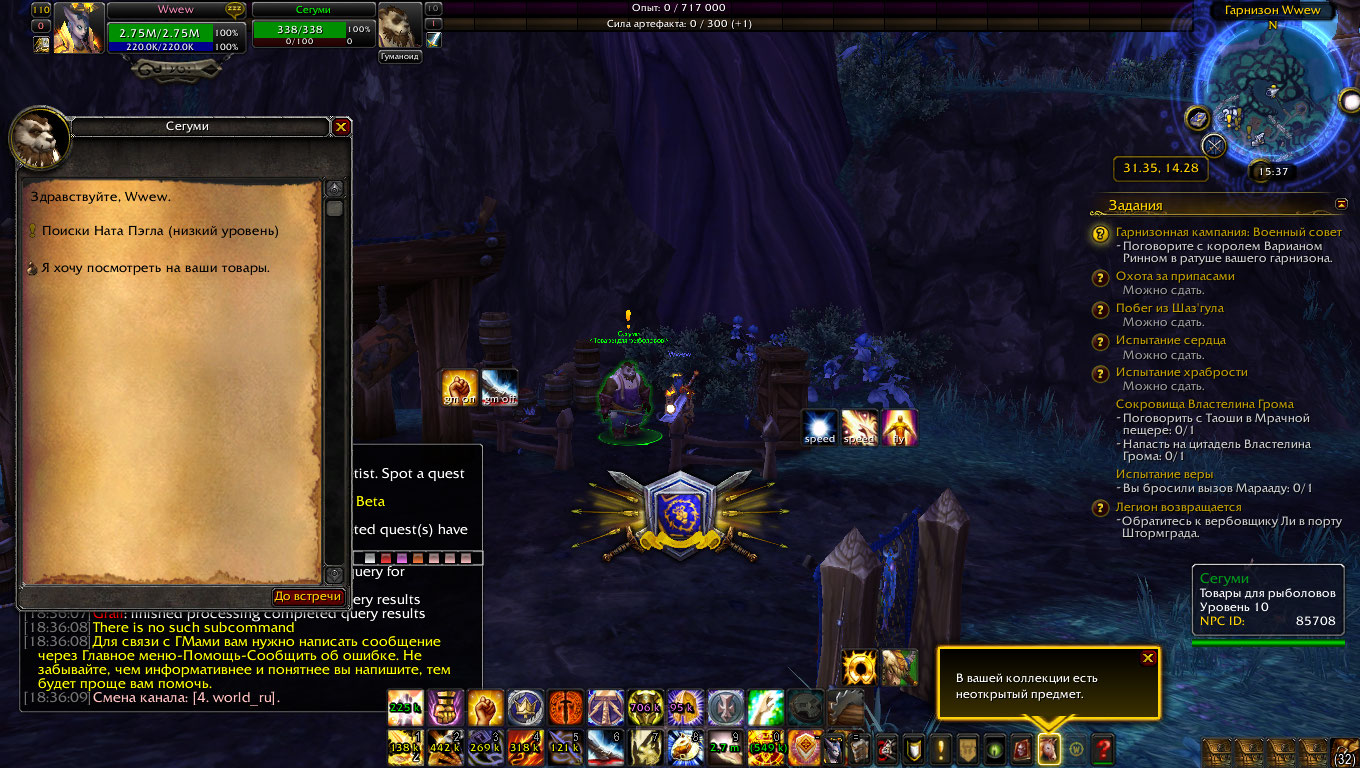 | Description | нпс https://ru.wowhead.com/npc=85708 не выдает задание https://ru.wowhead.com/quest=36608, преквест https://ru.wowhead.com/quest=36870 сделан. гарнизон 3 лвл. рыбацкая хижина тоже. Навык рыбной ловли 800. | ||||