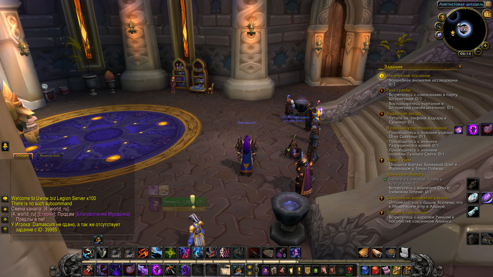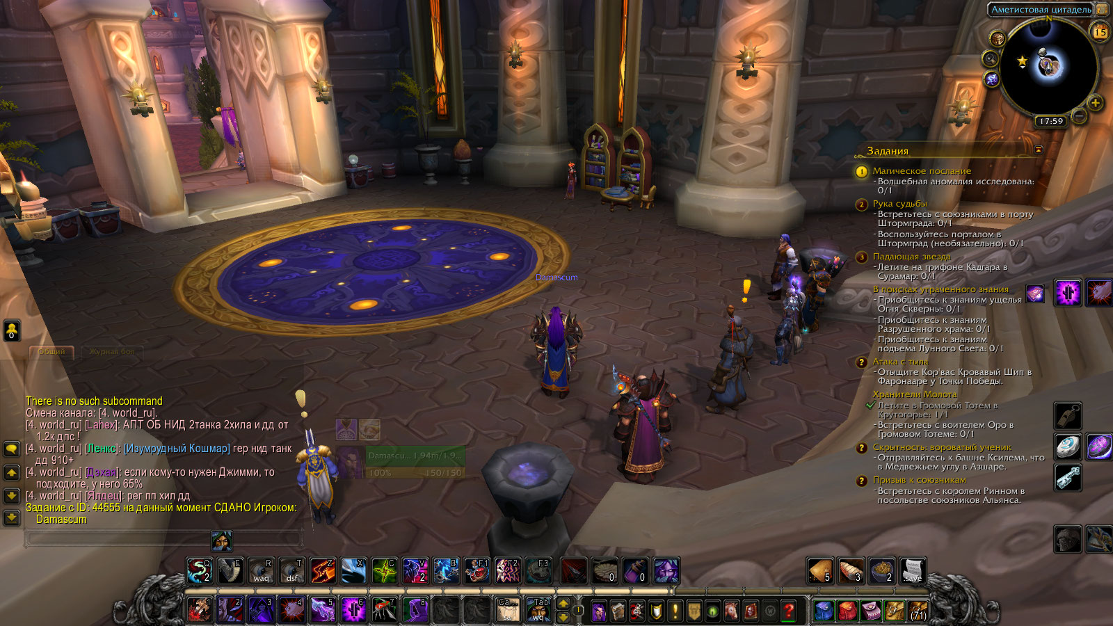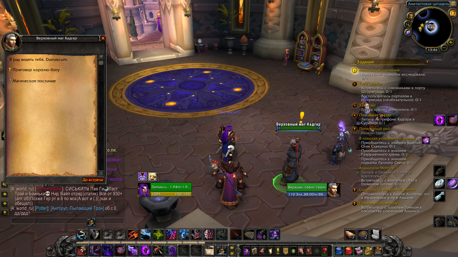 На всякий пожарный подмечу, когда делал кв на арт будучи не 110 лвла, была ситуация (что-то связанное с фазами ведать), когда заходишь в клоаку, по кв соответственно, там пусто и когда выходишь из неё, в Даларане так же пусто, приходиться релогаться. Со второго раза такого не было. |