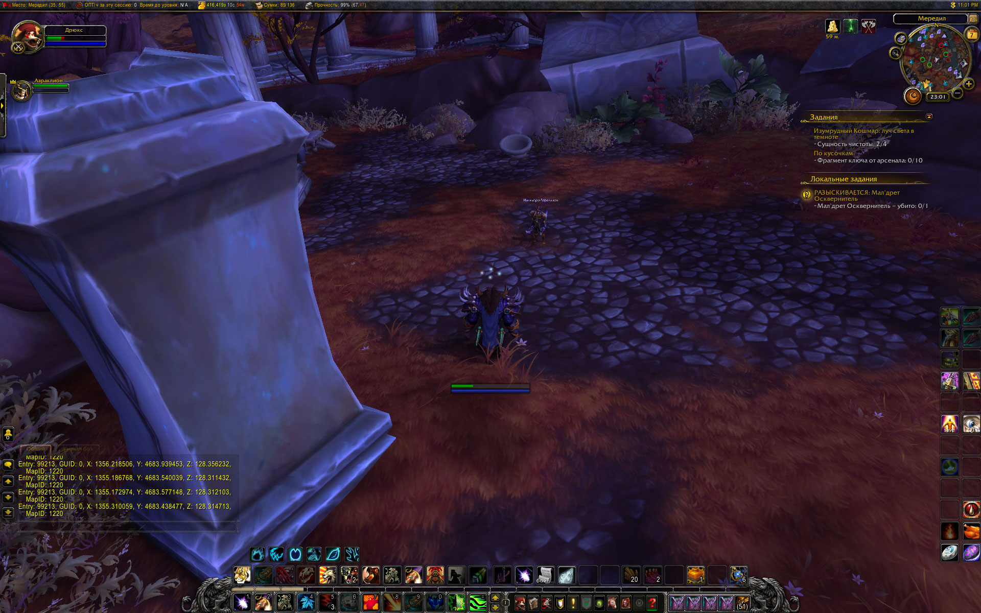 На скрине попытка друидом помочь другу ДХ пройти этот квест. На дру квеста не было, на ДХ был. НПЦ нет так как он видимо был убит перед нашим приходом. Но Тем не менее, урон и стан наносились обоим персонажам. Когти друида как ни странно, урона никому не наносили, а ДХ сумел убить 99213 (я видел это в полной версии лога), но в квест ему это не засчиталось. скрипт указывает на https://ru.wowhead.com/npc=99213/%D1%8D%D1%80%D0%B0%D0%B7%D0%BC-%D0%BB%D1%83%D0%BD%D0%BD%D1%8B%D0%B9-%D0%BA%D0%BB%D0%B8%D0%BD%D0%BE%D0%BA невидимые копии - почему копии - когда на ДХ делал этот квест и убивал 99213 , то только видимых копий НПЦ было три, плюс две, которые не было видно , но которые последовательно были убиты массовками ДХ. Урон наносился 99213, и соответственно первая строчка агролиста на нем, а вот стан накидывался чем то вроде "какойтотам иссохший", также невидимыми как для моего чара так и для друга. А то, что почему то входящий урон и соответственно, от кого он поступает не показывается в логах я тоже заметил. WoWScrnShot_020820_010131.jpg (471,567 bytes) |