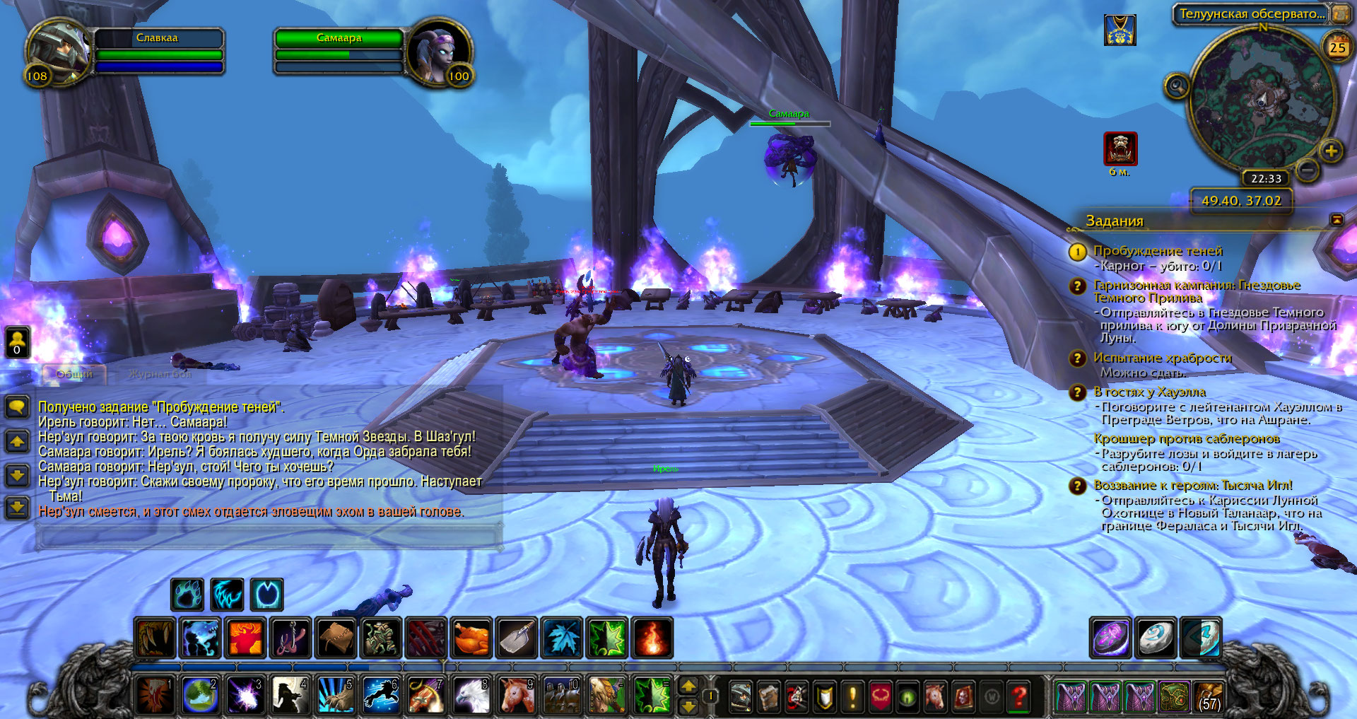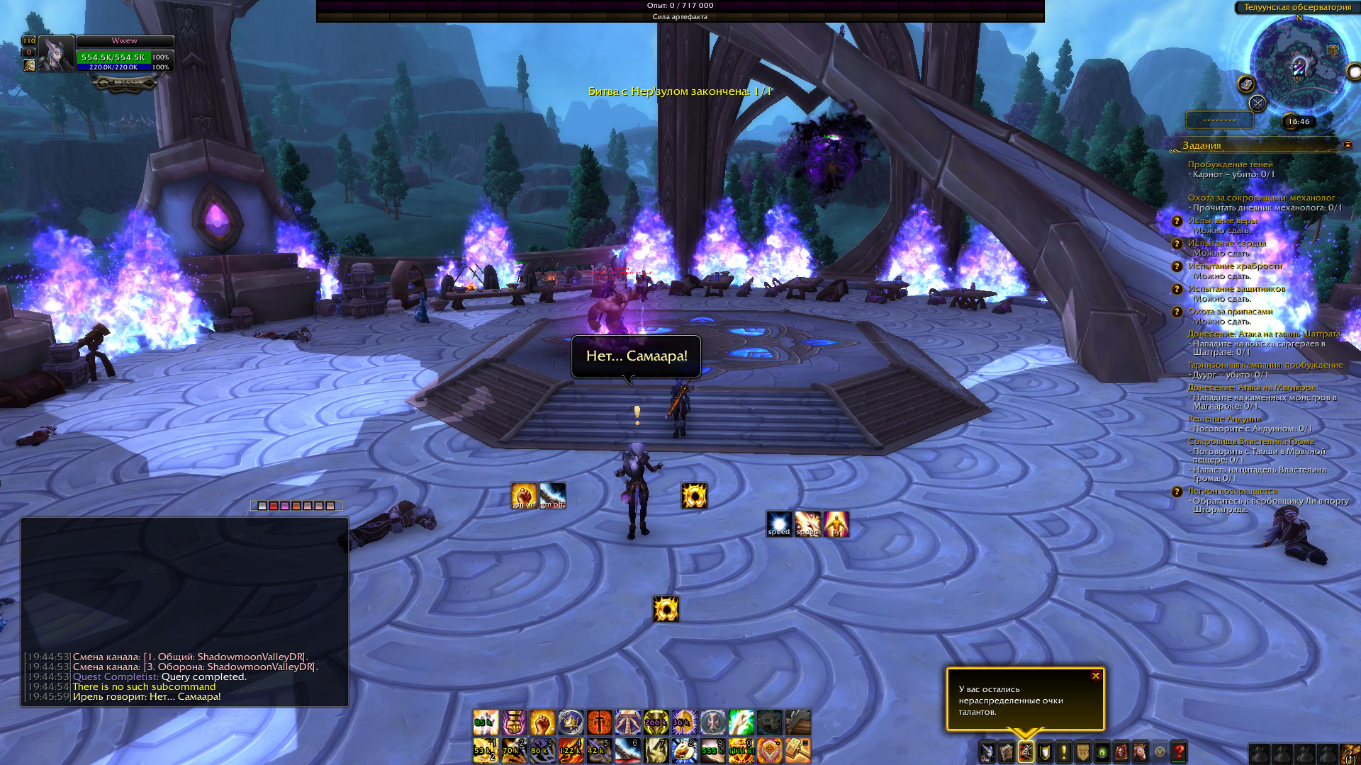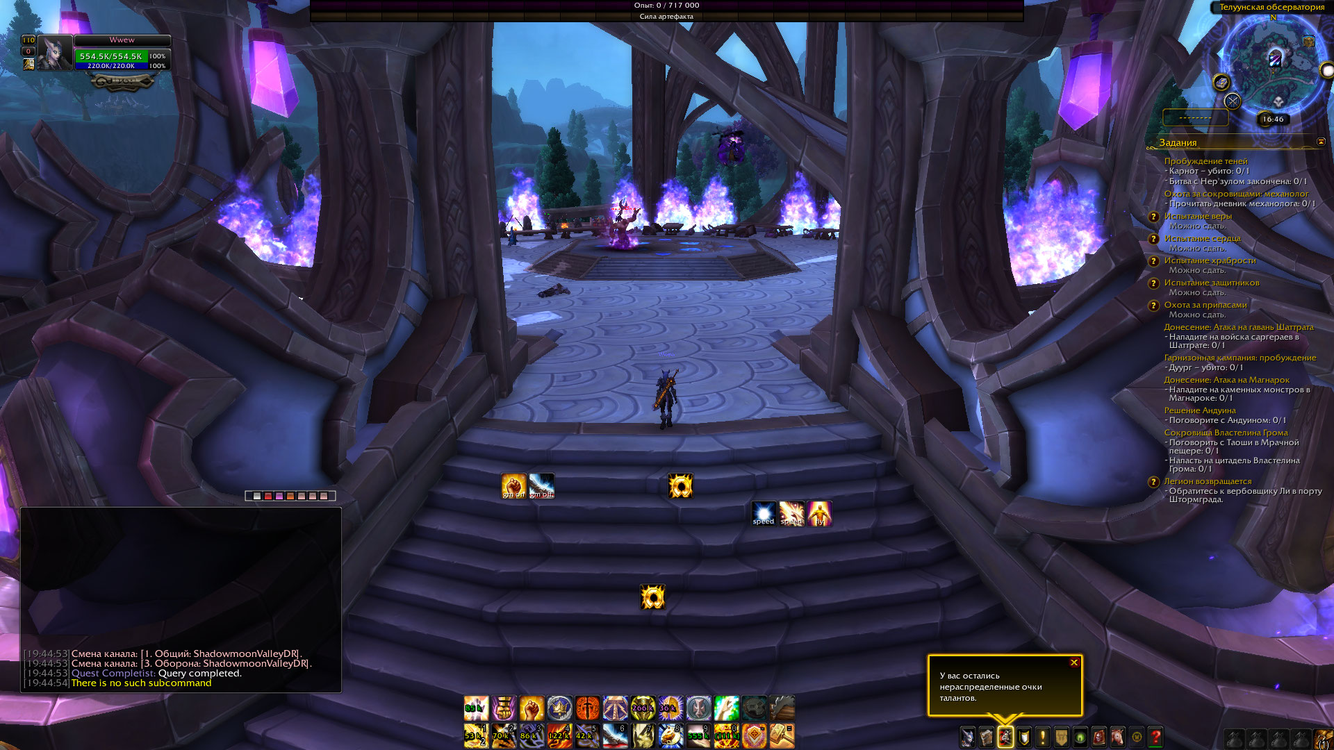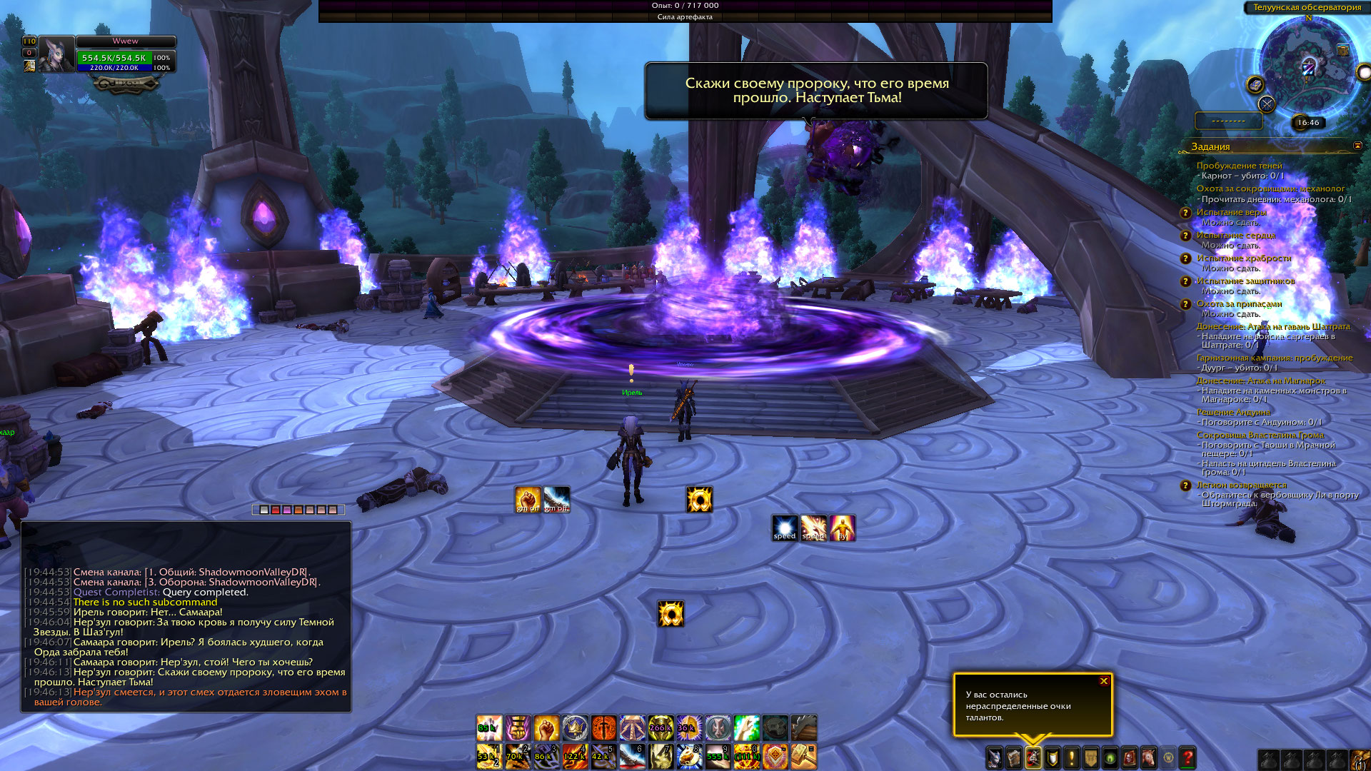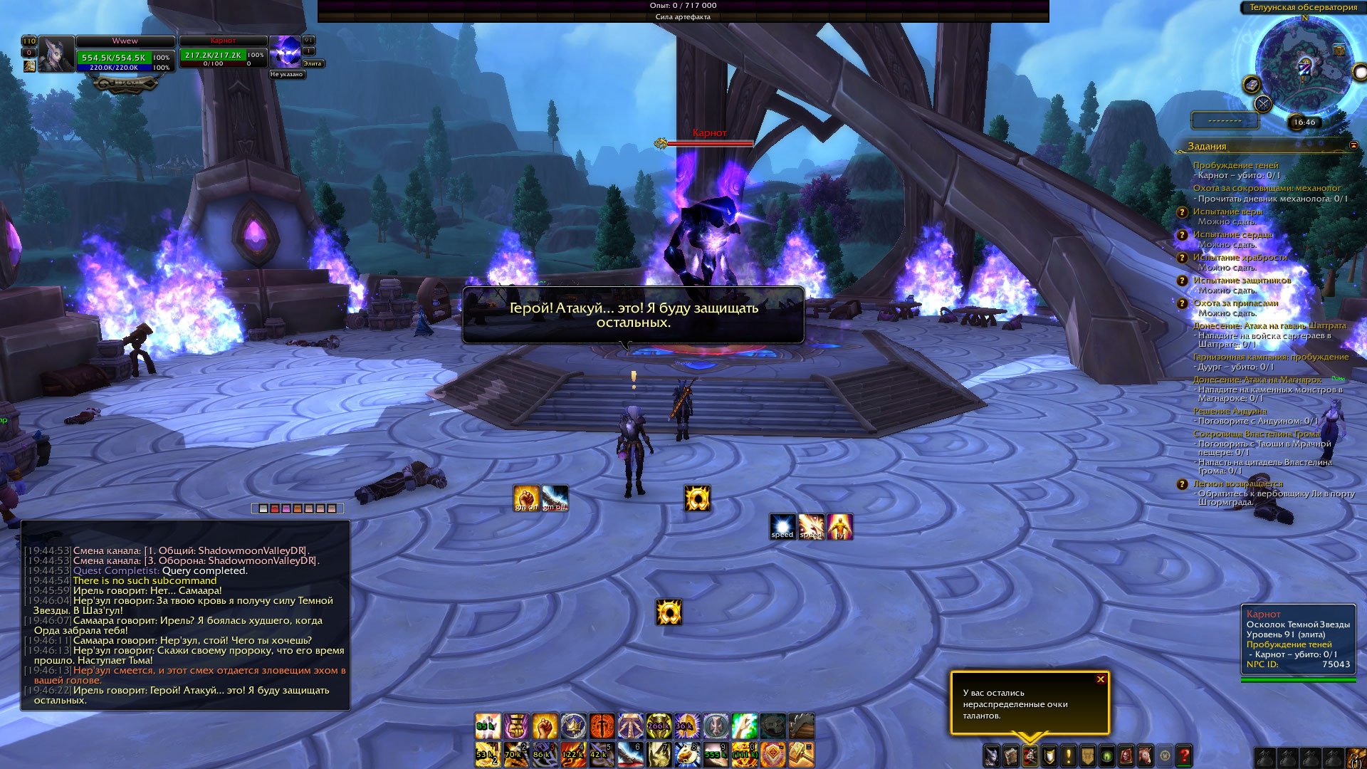 Добрый день! Я тоже застрял на квесте https://ru.wowhead.com/quest=34019 что я пытался делать : 1. Отменил квест 2. отключил все модификации 3. сделал исправление без телепортации персонажа 4. вошел в игру 5. взял квест 6 начал подниматься по ступенькам... дошел до Нер'зула, квест так и не запускается, бить нерзула нельзя у меня есть 1 решение - но я не знаю можно ли это заскриптовать, и на сколько сложно решение следующее : кликаем на Ирель - разговариваем с ней ( Вы добавляете строчку с текстом , запускающую квест в любом случае ) - и все довольны. |