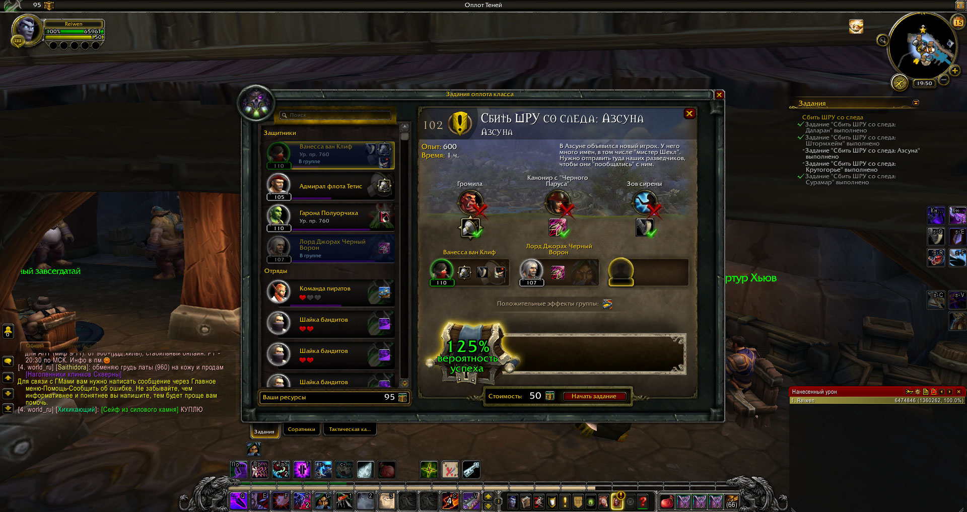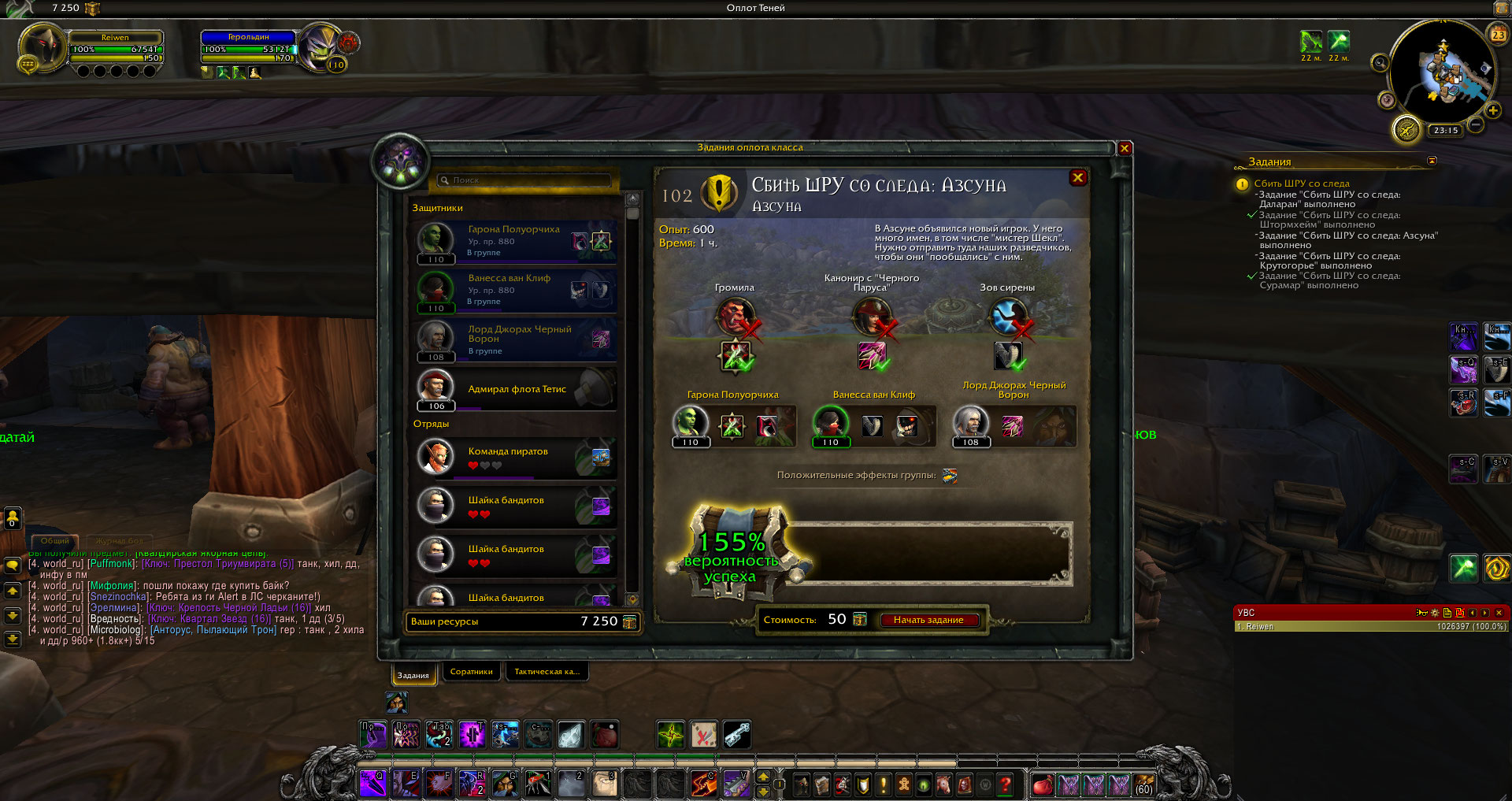 Здравствуйте. Пророк Вы а не я . В задаче Вы написали что невозможно выполнить или что задания нет. Не было предпосылок считать что миссия не стартует. Сделайте скриншот вкладки соратников, так чтобы было видно и тех, которых Вы уже получили и тех, что пока недоступны. Соберите с сундуков на Расколотом берегу хотя бы 1000 ресурсов оплота, заполните все слоты для соратников/отрядов перед стартом миссии, пробуйте запустить регулярные миссии оплота, чтобы прокачать соратников до необычного качества (зеленая иконка) и улучшите броню до 880. На разбойнике кампания оплота у меня уже выполнена, но тем не менее квестовые миссии кампании оплота все равно появляются в списке миссий. Относительно недавно делал миссии для кампании оплота ДХ - некоторые миссии пришлось выполнять по три раза, пока зачло - но они запускались по крайней мере. И предпочтительней для успешного завершения миссии было поставить одного соратника на босса и два отряда , дающих +30% к шансу успеха. Вообще два варианта, при которых миссия не запускается - недостаток ресурсов и превышение количества активных соратников над планкой в 5, 6 или 7 тел. Но в таком случае или пишется красным что "причина отказа старта миссии" или кнопка просто серая и ее невозможно нажать. Третий вариант - элитная миссия и изначальный расчетный шанс успеха миссии отрицательный - стратовать не получается, пока шанс не будет ббольше нуля - не рассматриваем, элитные миссии , они на 900+ илвл соратников рассчитаны. |