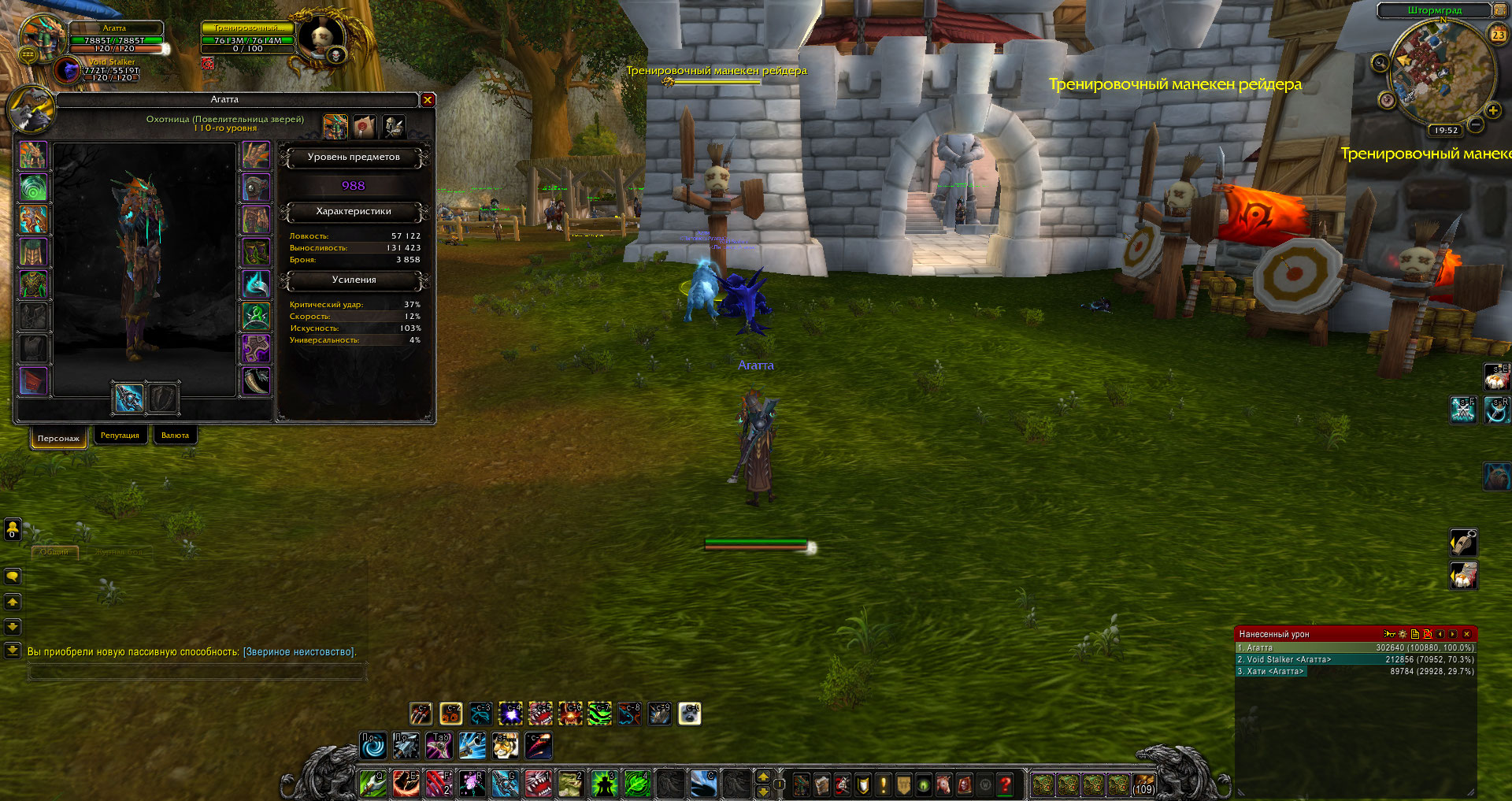 Prorok310 рассмотрим другие указаные тобой типо баги. 1) Знание зверя, оно находится во вкладке "Инструментарий питомца" если ты эту вкладку не заметил, то стоит обратиться к специалисту. если же во вкладке спелла нет, то сначала исправление персонажа через ЛК и чистка папки Cache в клиенте игры. а затем оформление нового репорта. 2) авто-касты у петов, есть уже такой репорт http://tracker.legionbugs.com/view.php?id=5316 и вообще сходи ознакомься с шаблоном, там вроде как учат пользоваться поиском перед созданием тем. 3) по топоту,искуси и молниеносным ударам тестер тебе уже ответил. по этому я оставлю только формулы урона авто-атак пета и хати(без учета других модов) Melee Attack Pet 1.5*2*0.6*AP/3.5 Melee Attack Hati 2*1.15*AP/3.5 где вместо AP используется показатель силы атаки охотника. и не забывай что урон физический а значит режется броней цели. и если 110лвл персонаж бьет рейд-босса или манекен имитирующей рейд босса то броня срежет урон по формуле Attacker K/(Attacker K + Target Armor) или 7390/(7390+3474) =0.680228 что означает что броня срежет урон до 68% от расчетного |