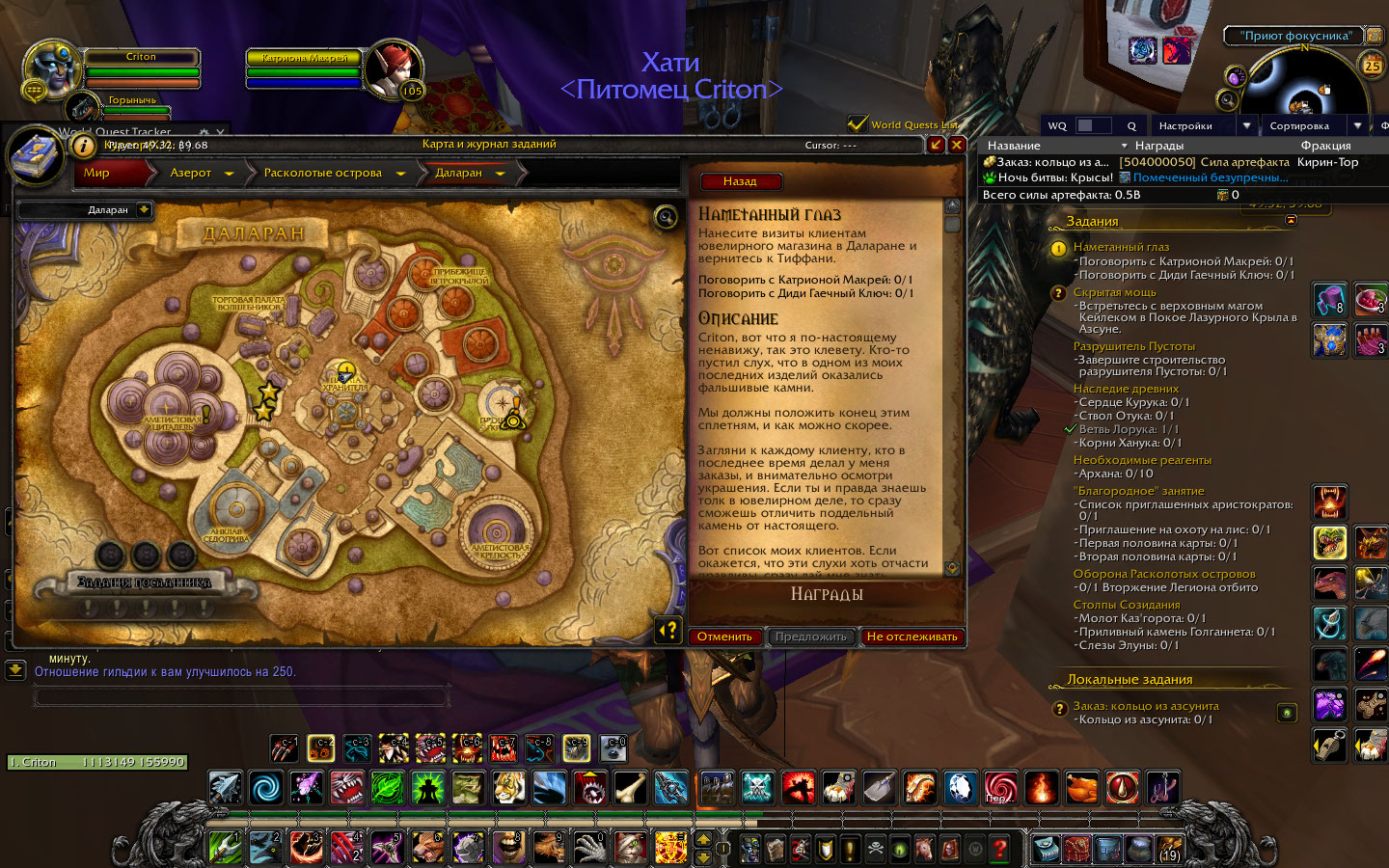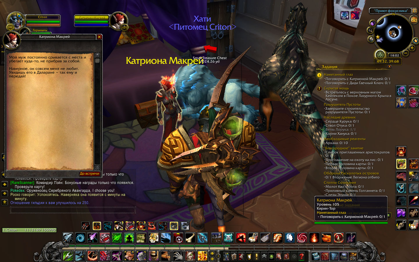 | Description | В квесте "Наметанный глаз" (дает учитель ювелирного дела в Новом Даларане) не пашет НИП "Катриона Макрей". С ней необходимо поговорить, что сделать нет возможности (нет в открывающемся диалоге данной функции). Поправьте пож. А то ювелирка зависла. | ||||