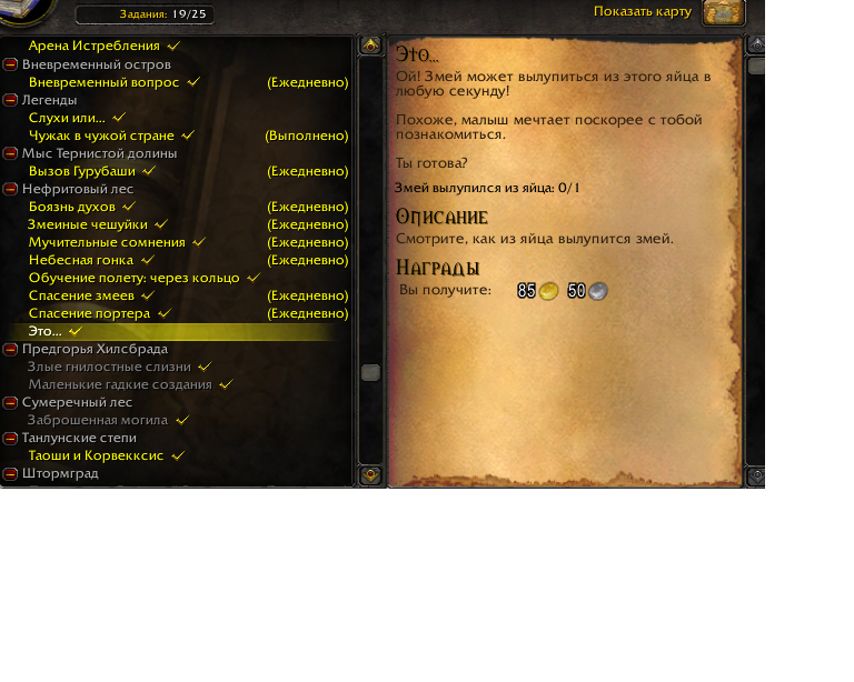 | Description | Доброго времени суток! У меня появилась проблема при прохождении квеста "это...",(выполнял цепочку квестов что-бы научится летать на змеях). Суть проблемы в том, что при получении этого квеста должен сразу вылупится питомец(змей) из яйца. Но у меня абсолютно ничего не произошло, и квест просто висит. | ||||