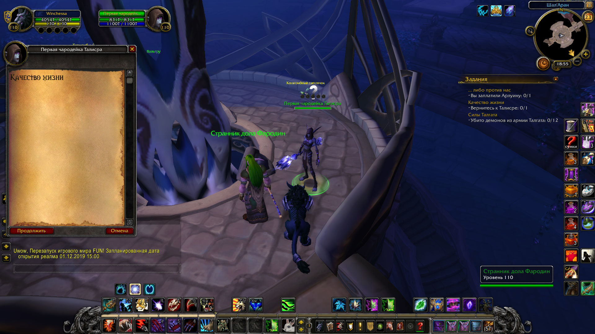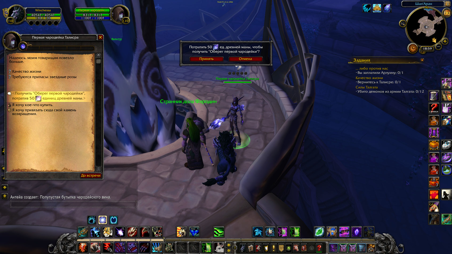 у меня не работает сдача этого квеста Талисре. справа, как можно увидеть, написано, что можно его сдать. слева окно диалога и он серый. соответственно не сдается. я пробовала перезаходить и отменять и делать его снова, сдать нельзя. квест простой,в три этапа, на вовхеде есть видео прохождения: https://ru.wowhead.com/quest=40470/%D0%BA%D0%B0%D1%87%D0%B5%D1%81%D1%82%D0%B2%D0%BE-%D0%B6%D0%B8%D0%B7%D0%BD%D0%B8 кстати, в видео сначала надо напоить маной Талисру, а у меня такого нет. есть только выменять 50 маны на оберег, что тоже, кстати, не работает! выменять - не работает (мана есть, и больше, чем 50), сдать - не работает. прикладываю скрины WoWScrnShot_112319_185345.jpg (401,792 bytes) |