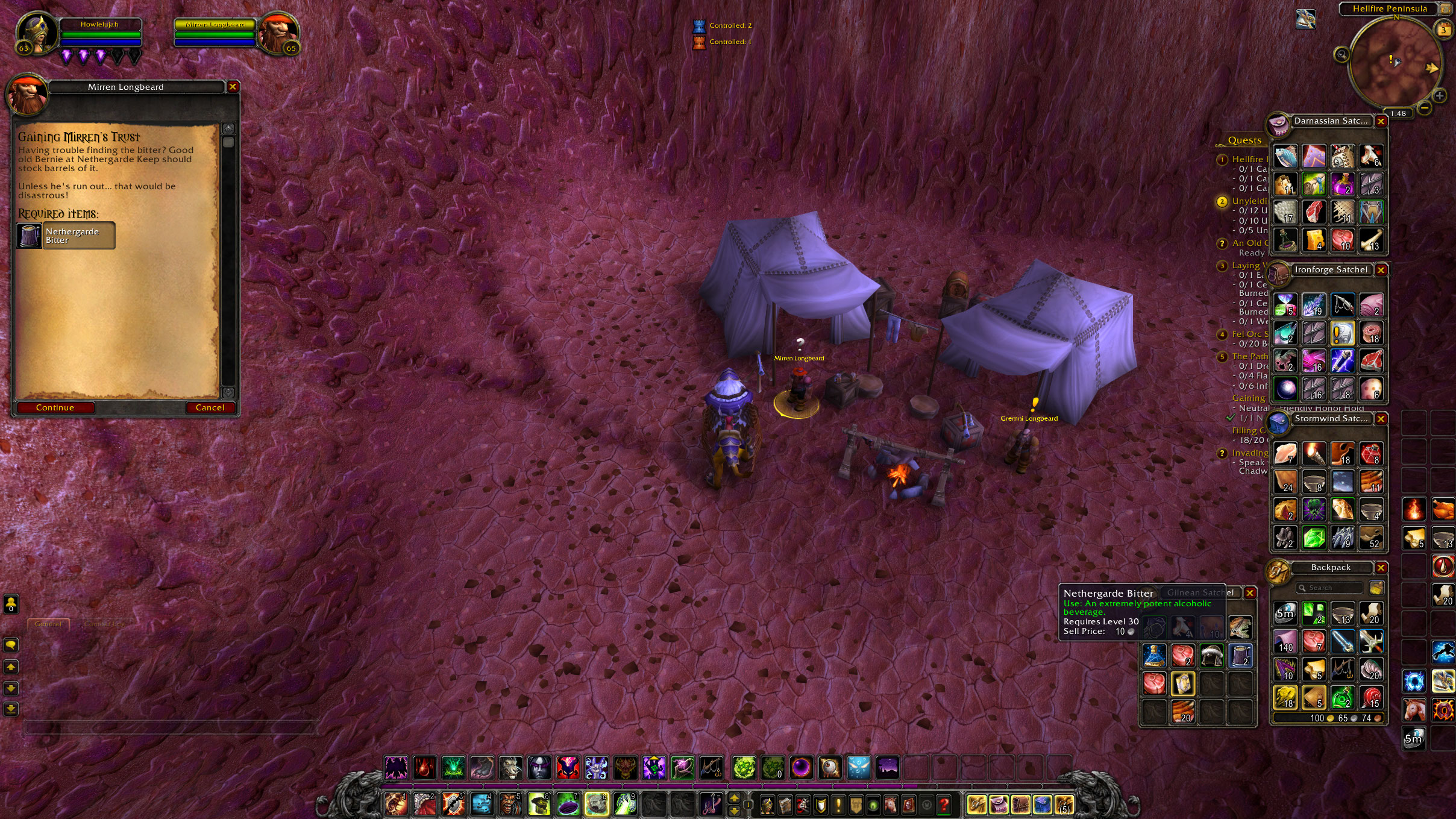 | Description | Gaining Mirrin's Trust https://www.wowhead.com/quest=9563/gaining-mirrens-trust requires bringing him a "Nethergarde Bitter". I brought him one, obtained his quest, but the quest won't complete. | ||||