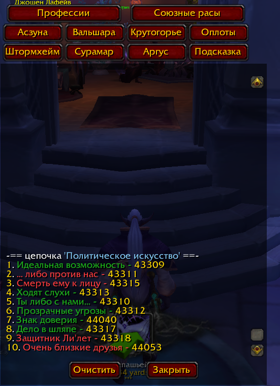 УРАА ПОЛУЧИЛОСЬ !!! Также были проблемы с квестом https://ru.wowhead.com/quest=43318 по квесту меня телепортировало на бой с https://ru.wowhead.com/npc=110354 , однако подойти к данному нпс нельзя - при входе на импровизированую зону боя ( прямоугольная область на полу) меня телепортирует к https://ru.wowhead.com/npc=107632 и подойти нет возможности ( несколько раз отменял и брал данный квест снова) , хорошо что у меня был слабый спелл для дальнего боя , я сумел добиться чтобы https://ru.wowhead.com/npc=110354 подошел ко мне , после чего я его убил . и вступил в эту область - меня телепортировало, и я успешно завершил цепочку ( в достижениях прописалось ) |