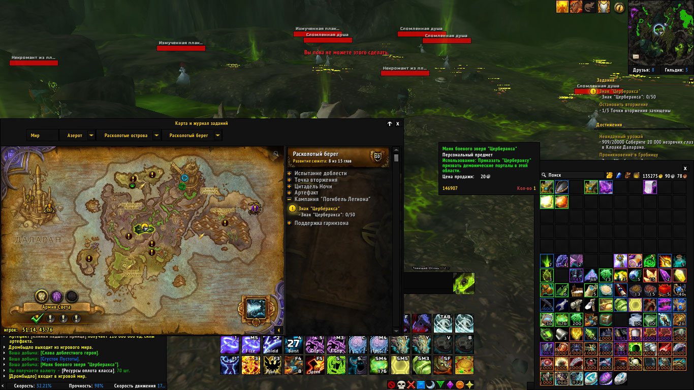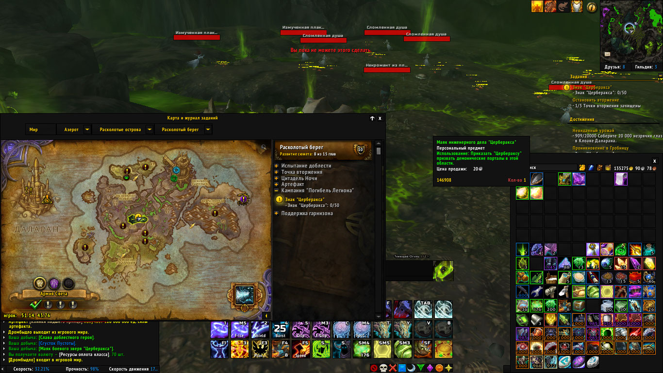 | Steps To Reproduce | Берем квест, прилетам на место, все как на видео. Убиваем моба, из него должен выпадать данные предмет, что бы открыть портал: https://ru.wowhead.com/item=146908/маяк-инженерного-дела-церберакса Предмет не выпадает соответственно нельзя открыть портал, убить мобов и полутать с них данный предмет https://ru.wowhead.com/item=147582/знак-церберакса в кол-ве 50 шт. что бы сдать квест. | ||||