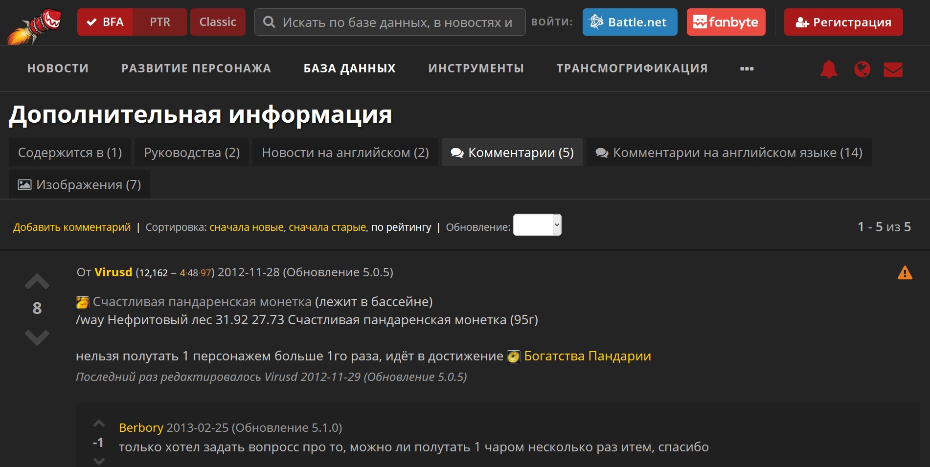 DescriptionСокровища для достижения https://ru.wowhead.com/achievement=7994 (в частности, https://ru.wowhead.com/item=85781) имеют таймер респауна в 2 минуты и доступны для повторного получения одним и тем же персонажем, хотя предполагается, что сокровище доступно лишь один раз, в рамках неотмечаемого квеста https://www.wowhead.com/quest=31401/flag-lucky-pandaren-coin и ему подобных.
